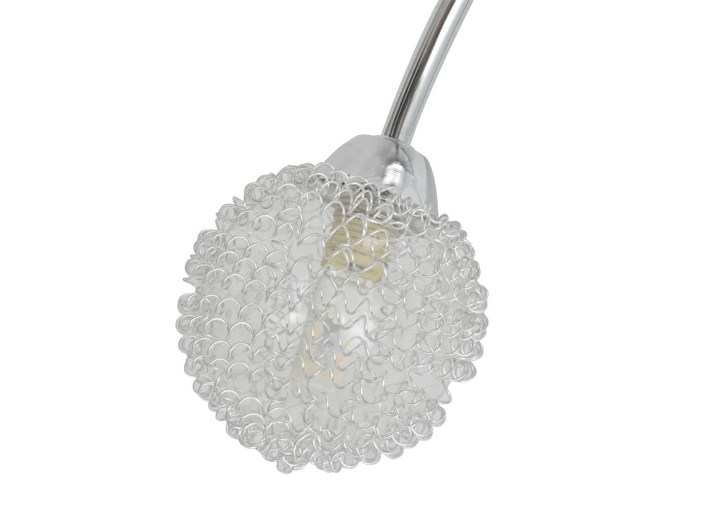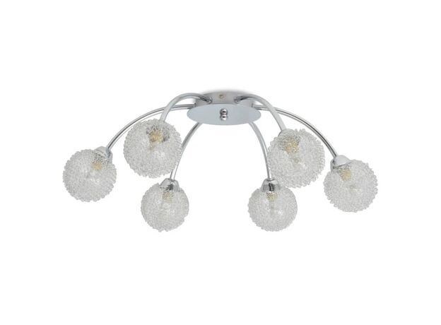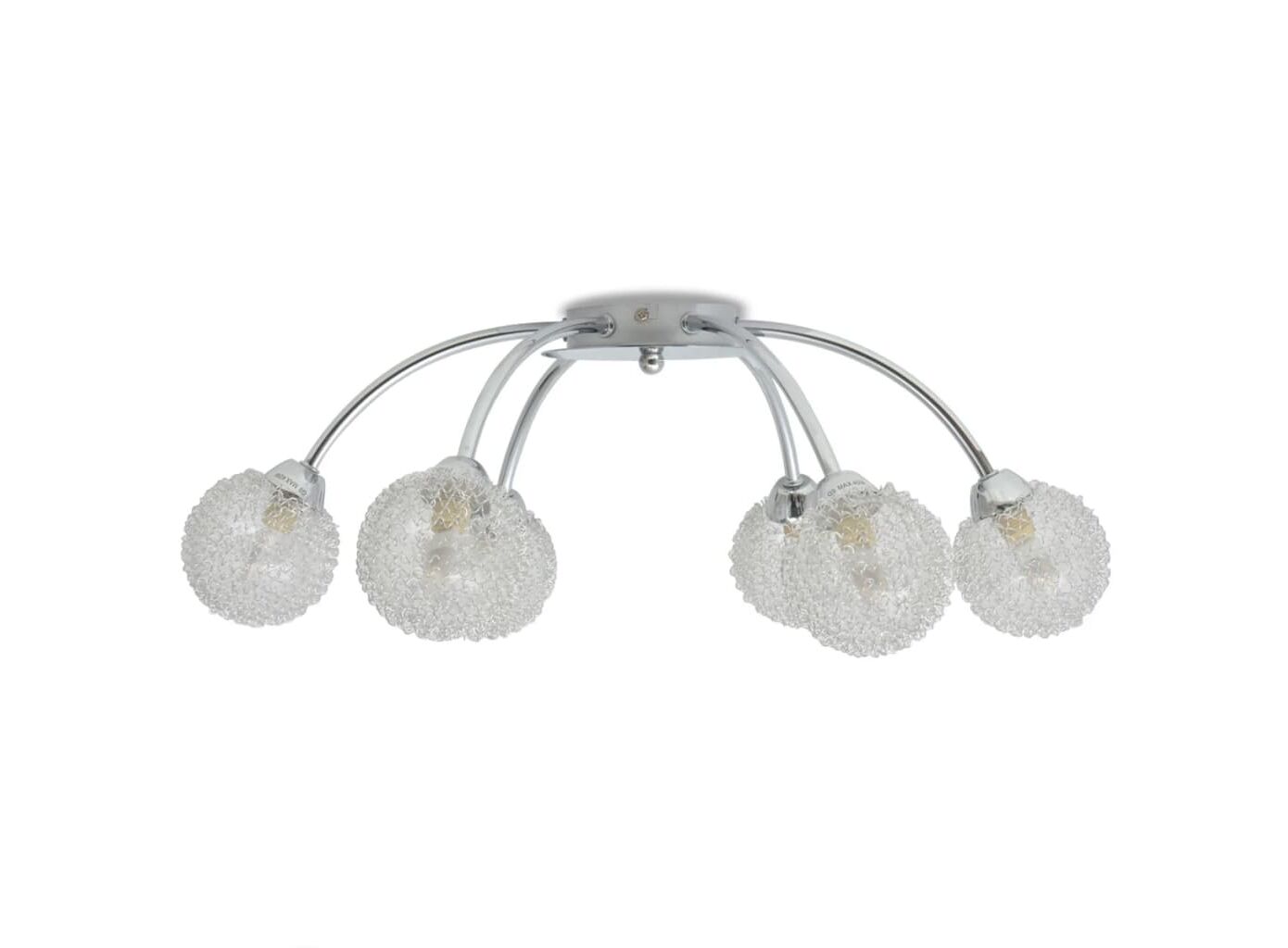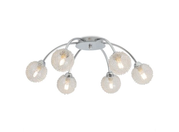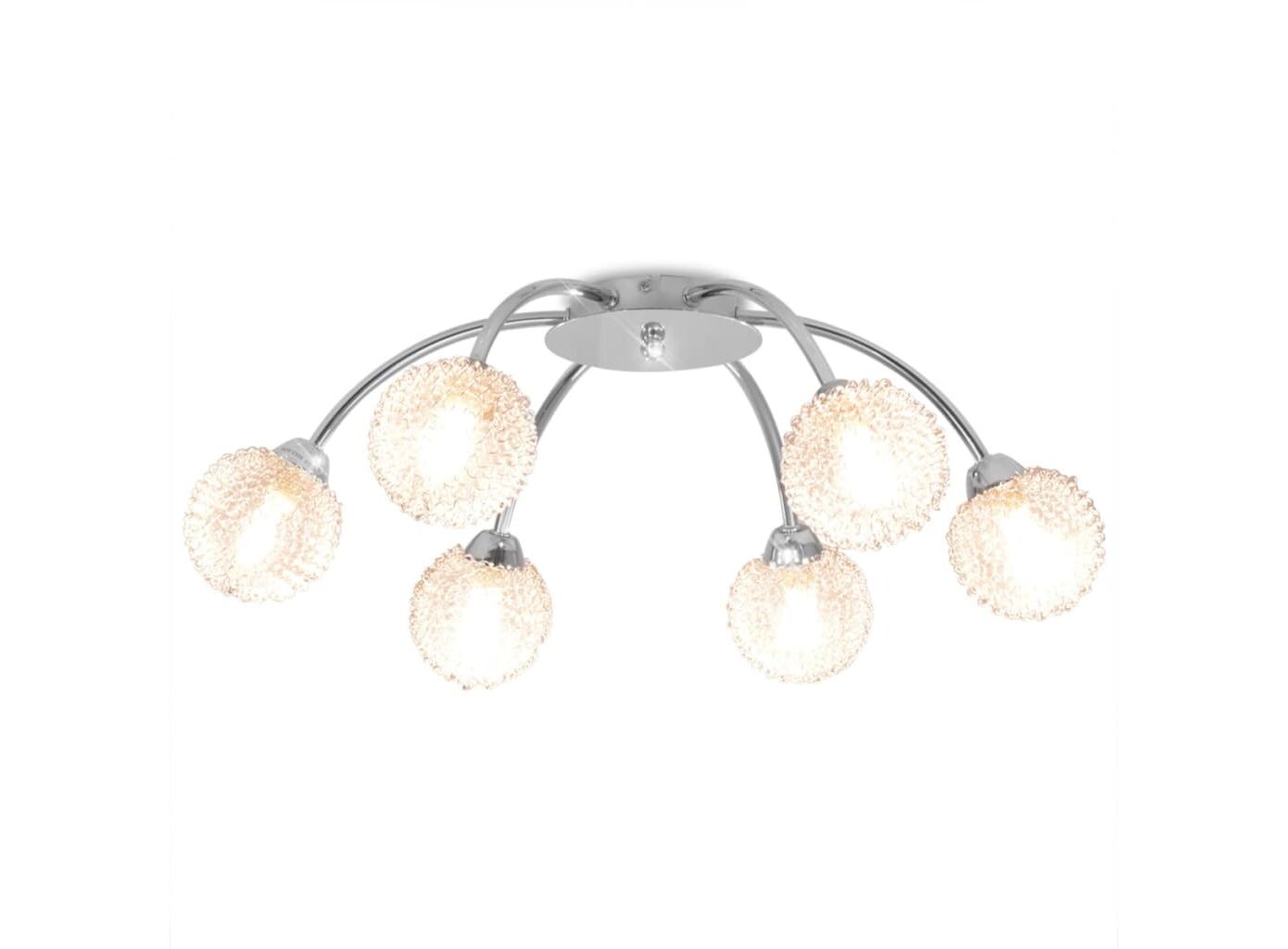 Această lustră poate fi montată cu ușurință pe orice plafon, datorită bazei metalice de calitate superioară. Cele șase tuburi metalice arcuite îi dau un aspect elegant. O lumină albă caldă se va filtra prin abajururile de sticlă delicate, luminând fiecare colț al camerei. Plasa lucioasă de sârmă, care decorează abajururile, reflectă lumina, amplificându-i strălucirea. Această lampă de tavan deosebită va arăta extraordinar în orice încăpere a casei.