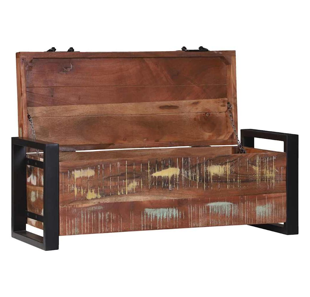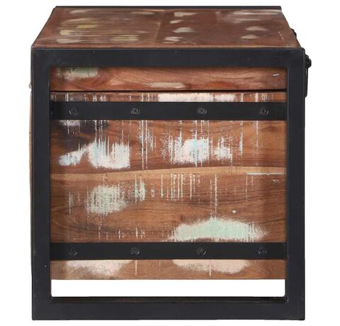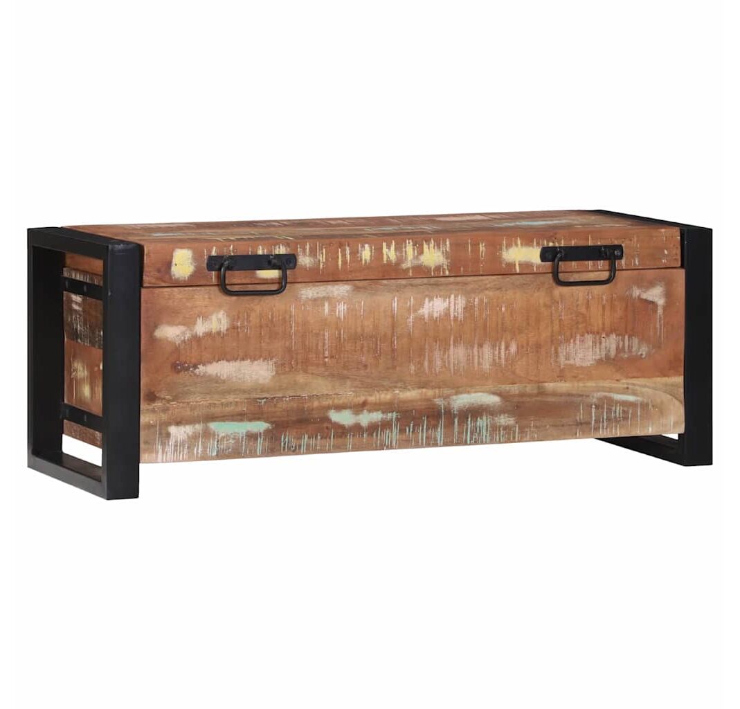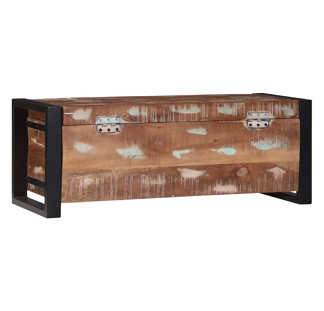 Cufărul ăsta îmbină funcționalitatea cu un look rustic care impresionează. E făcut din lemn masiv recuperat și o ramă metalică neagră serioasă, fiind super practic pentru depozitare și un element cool în livingul tău.