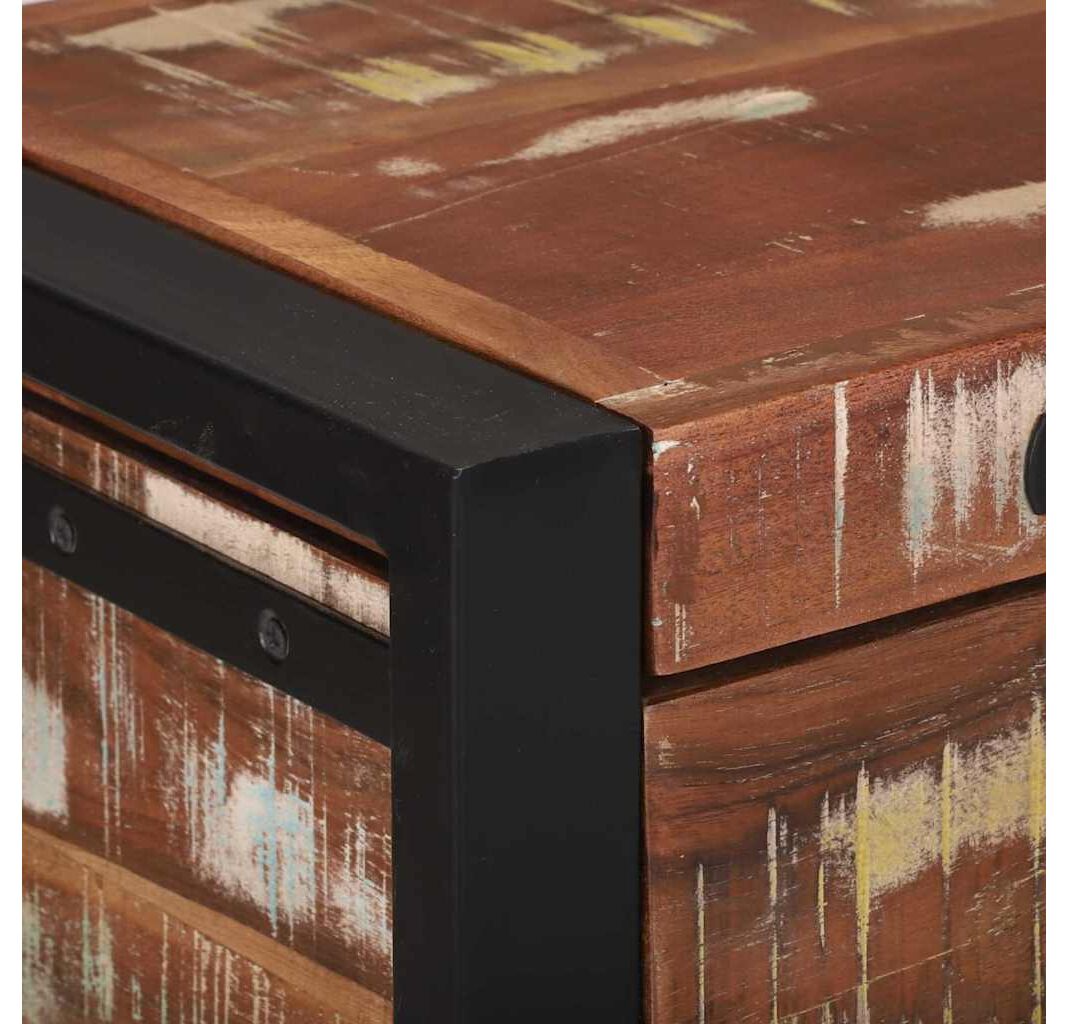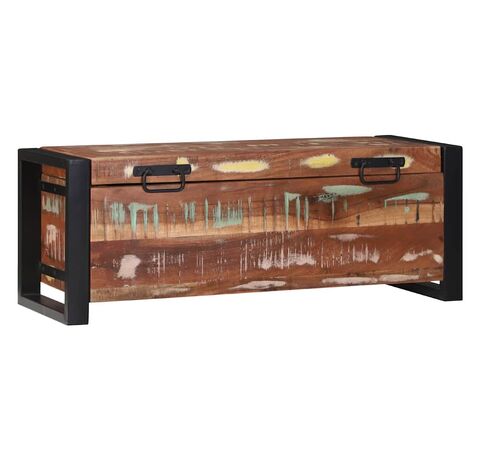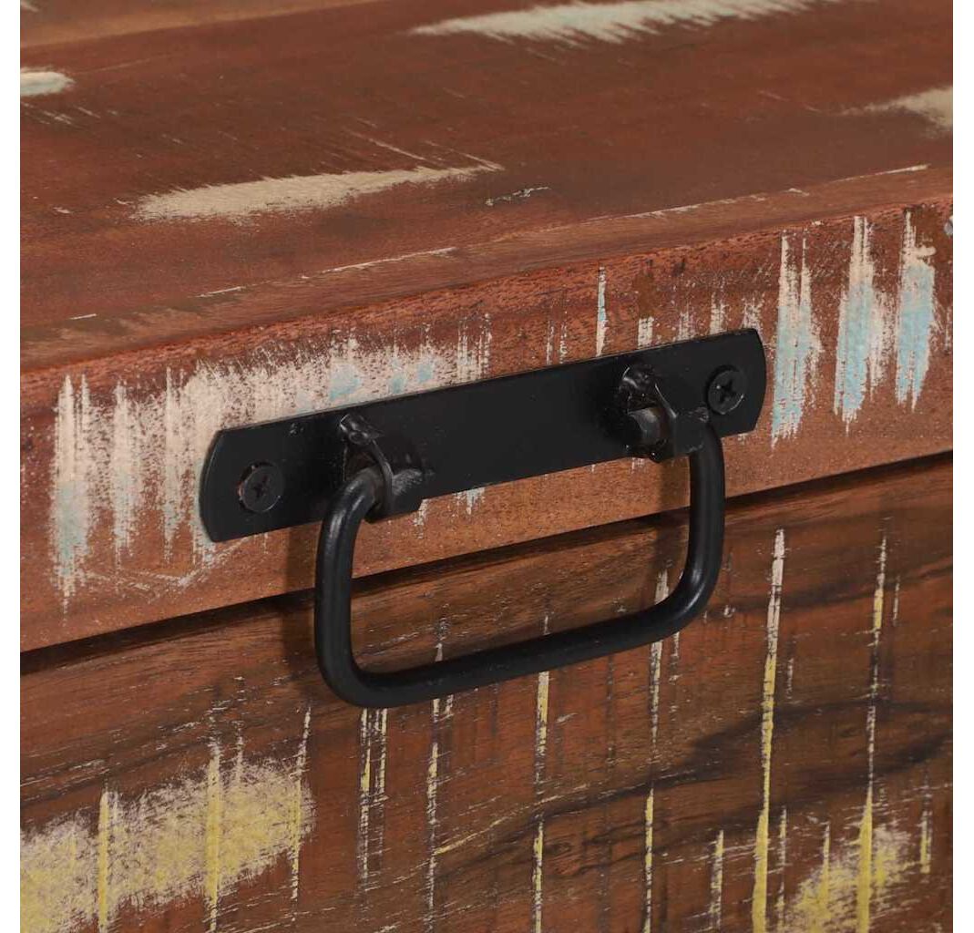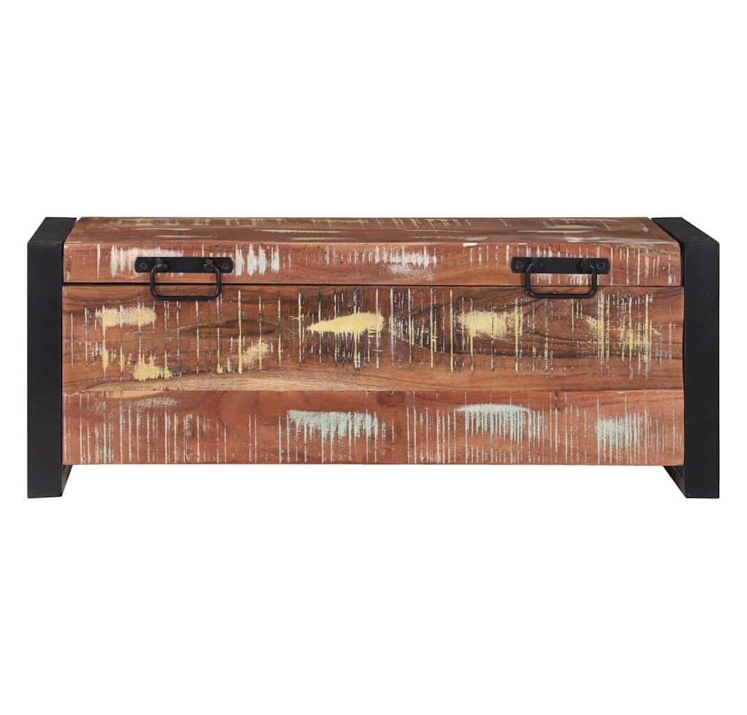 Cufărul ăsta îmbină funcționalitatea cu un look rustic care impresionează. E făcut din lemn masiv recuperat și o ramă metalică neagră serioasă, fiind super practic pentru depozitare și un element cool în livingul tău.