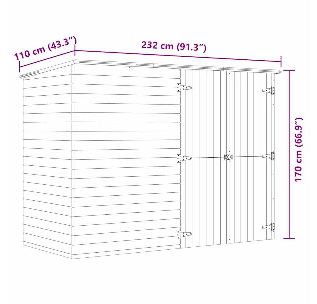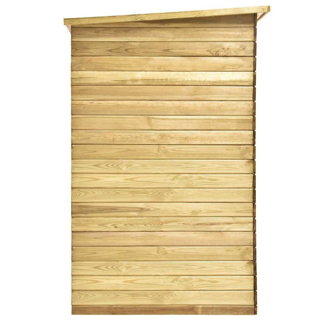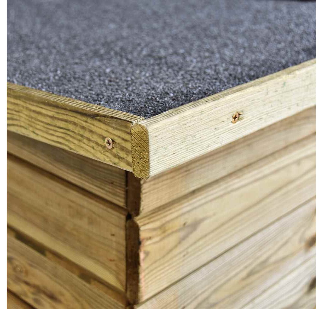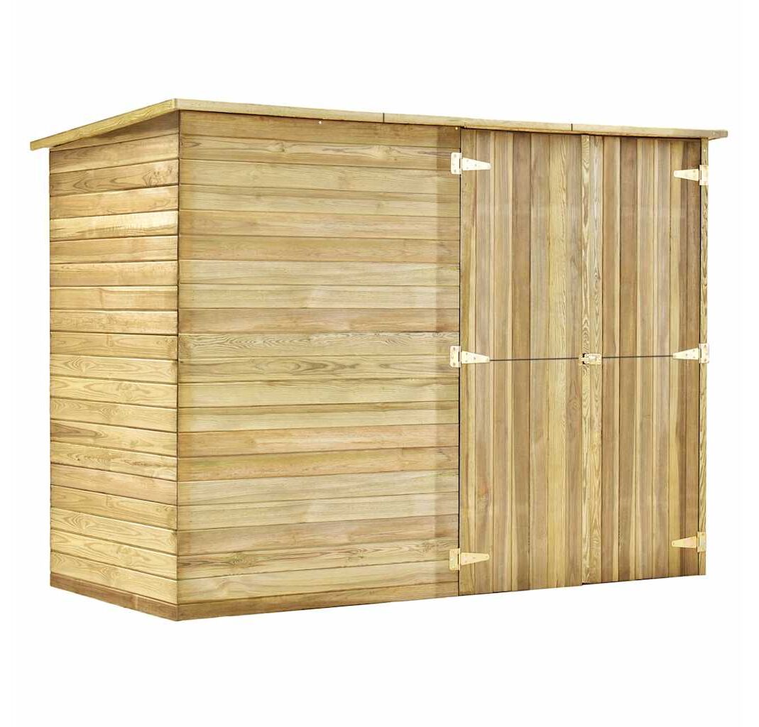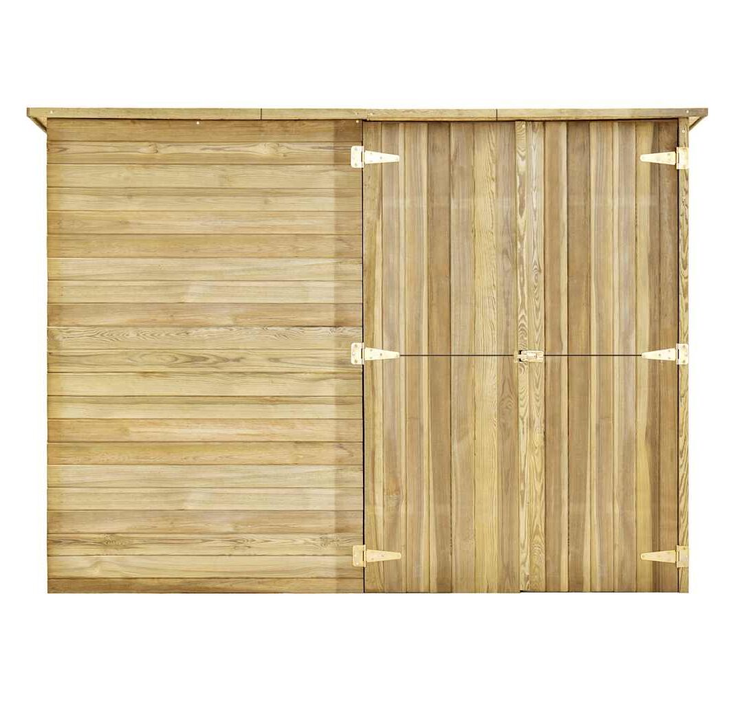 Construit din lemn de pin tratat de calitate, acest șopron este durabil și rezistent la intemperii. Acoperișul său este acoperit cu pâslă bituminată, care protejează magazia de depozitare împotriva umezelii. Datorită designului cu două uși, această magazie pentru biciclete este ușor de accesat. În plus, zăvorul oferă o securitate suplimentară.