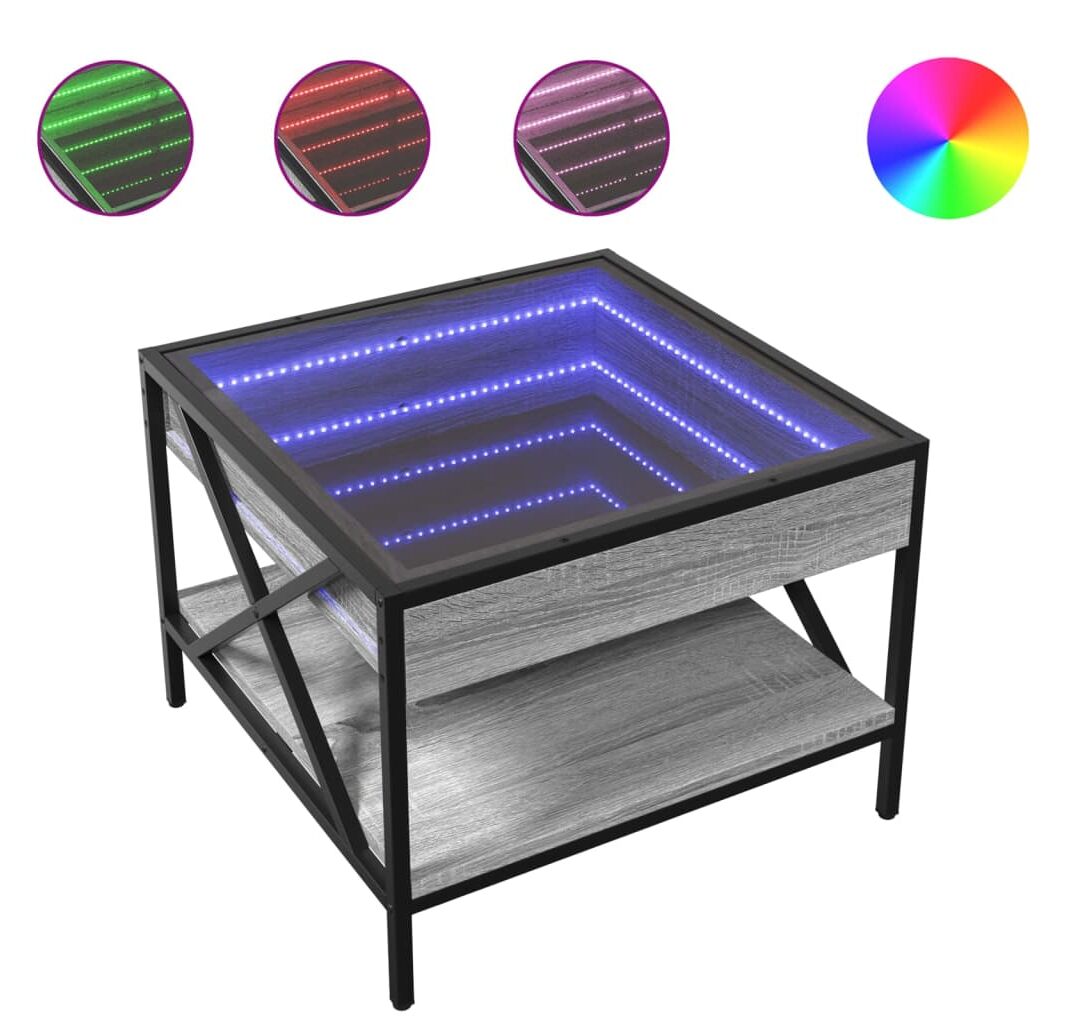 Măsuța de cafea unică, cu oglindă cu LED infinity, este potrivită pentru diferite locuri.