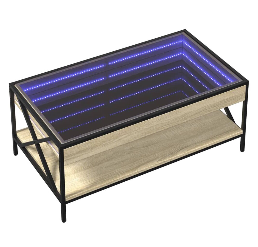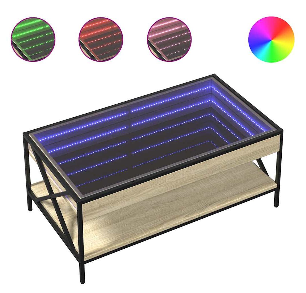 Măsuța de cafea unică, cu oglindă cu LED infinity, este potrivită pentru diferite locuri.