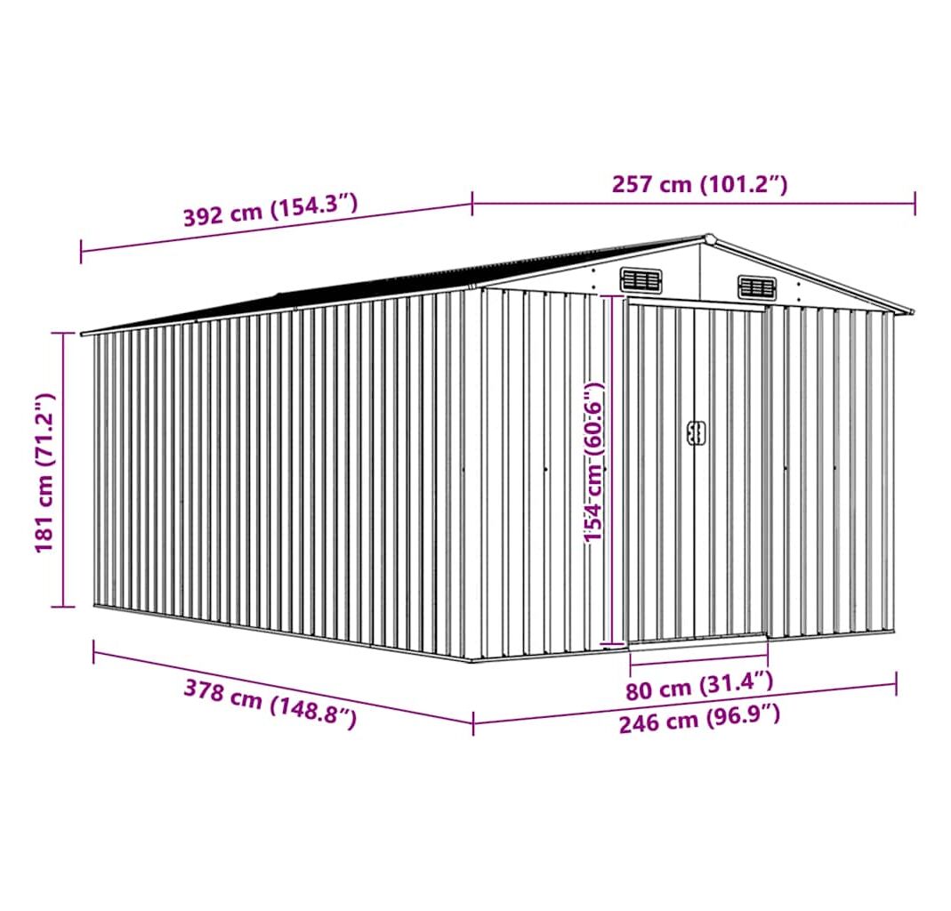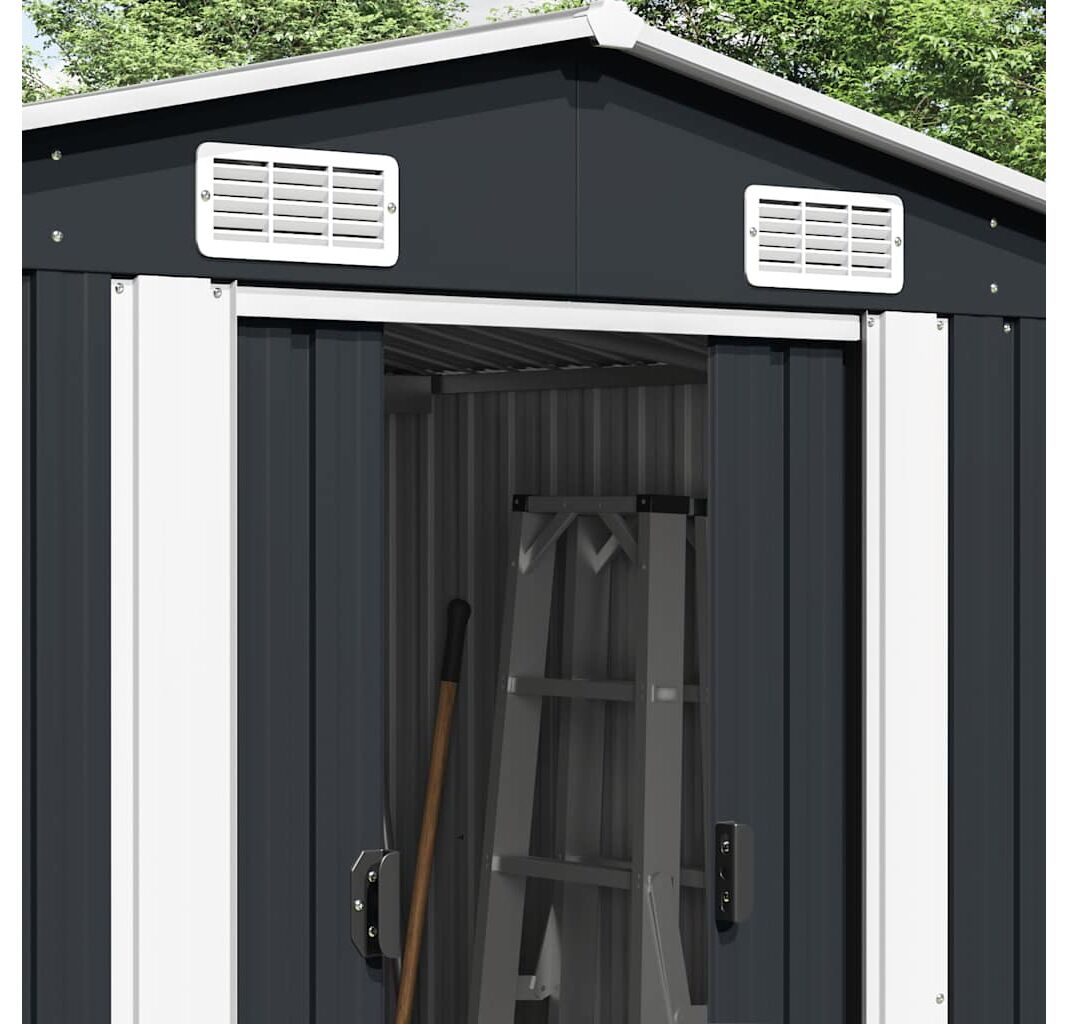 Această magazie de depozitare are guri de aerisire atât în față, cât și în spate, asigurând o ventilație excelentă. Ușile duble glisante din față permit accesul ușor la intrare sau ieșire. Datorită construcției din oțel galvanizat și finisajului vopsit electrostatic, magazia de depozitare pentru unelte este durabilă și rezistentă și nu se va coroda și nu va fi afectată de condițiile meteorologice nefavorabile.