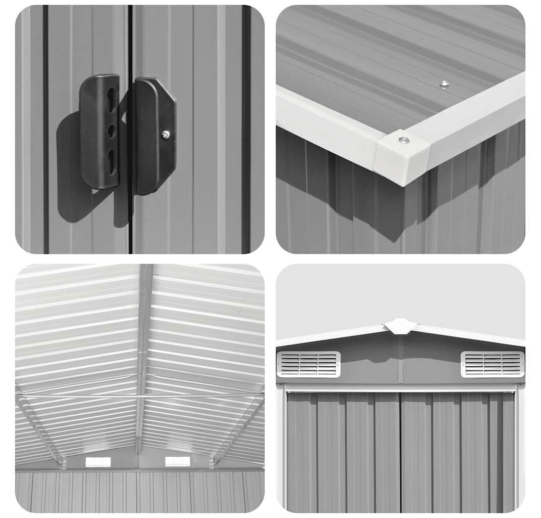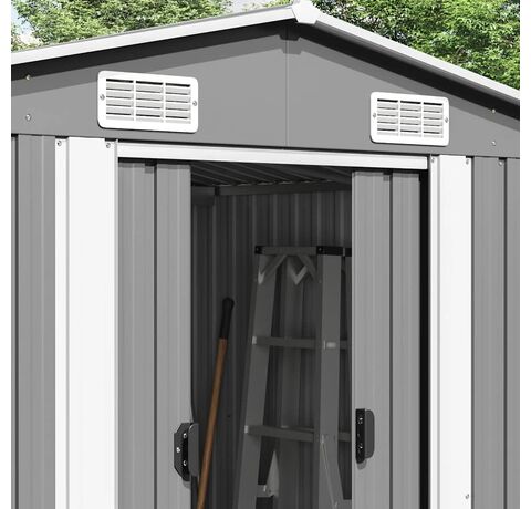 Această magazie de depozitare are guri de aerisire atât în față, cât și în spate, asigurând o ventilație excelentă. Ușile duble glisante din față permit accesul ușor la intrare sau ieșire. Datorită construcției din oțel galvanizat, împreună cu finisajul vopsit electrostatic, magazia de depozitare pentru scule este durabilă și puternică.