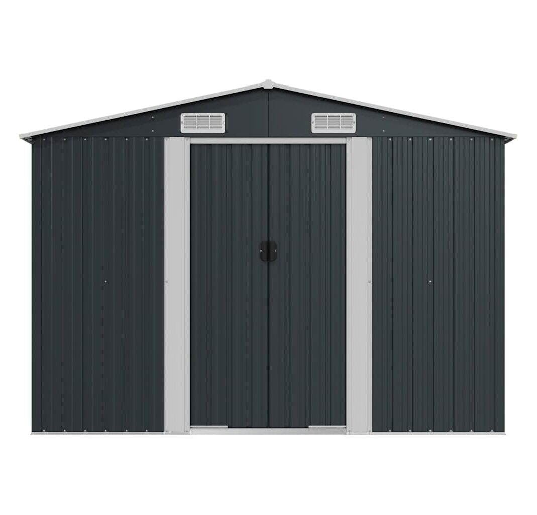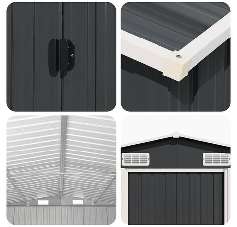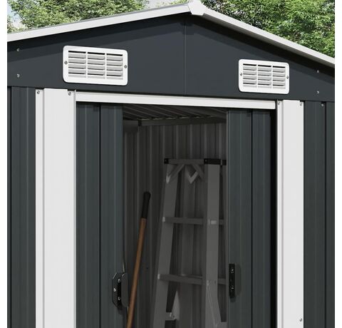 Această magazie dispune de orificii de ventilație, asigurând o ventilație excelentă. Ușile sale glisante duble din față permit intrarea și ieșirea ușoară. Datorită construcției din oțel galvanizat, magazia pentru unelte este durabilă și rezistentă și nu se va coroda și nu va fi afectată de condițiile meteorologice nefavorabile.
