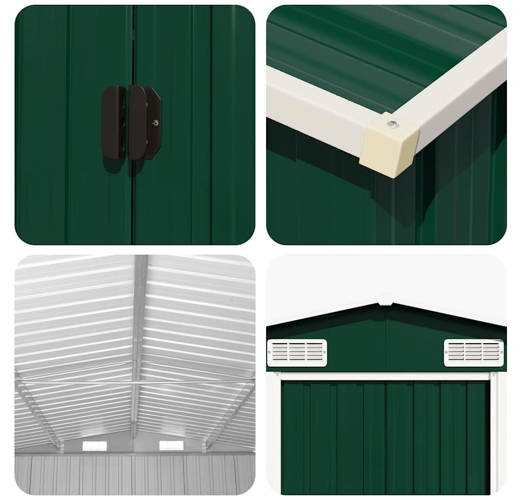 Această magazie dispune de orificii de ventilație, asigurând o ventilație excelentă. Ușile sale glisante duble din față permit intrarea și ieșirea ușoară. Datorită construcției din oțel galvanizat, magazia pentru unelte este durabilă și rezistentă și nu se va coroda și nu va fi afectată de condițiile meteorologice nefavorabile.