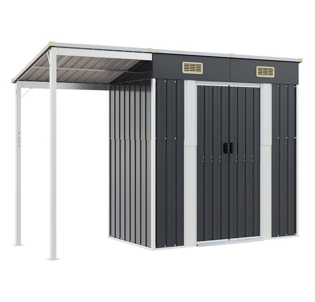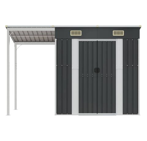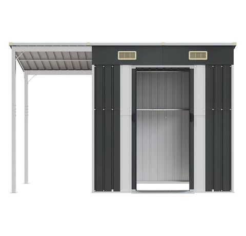- Spațiu amplu de depozitare: Această magazie metalică oferă mult spațiu pentru a depozita lemne de foc, unelte de grădină, mobilier, echipamente și multe altele. De asemenea, are un acoperiș extins pentru depozitarea lemnelor de foc. Acoperișul poate fi fixat pe ambele părți ale șopronului.
