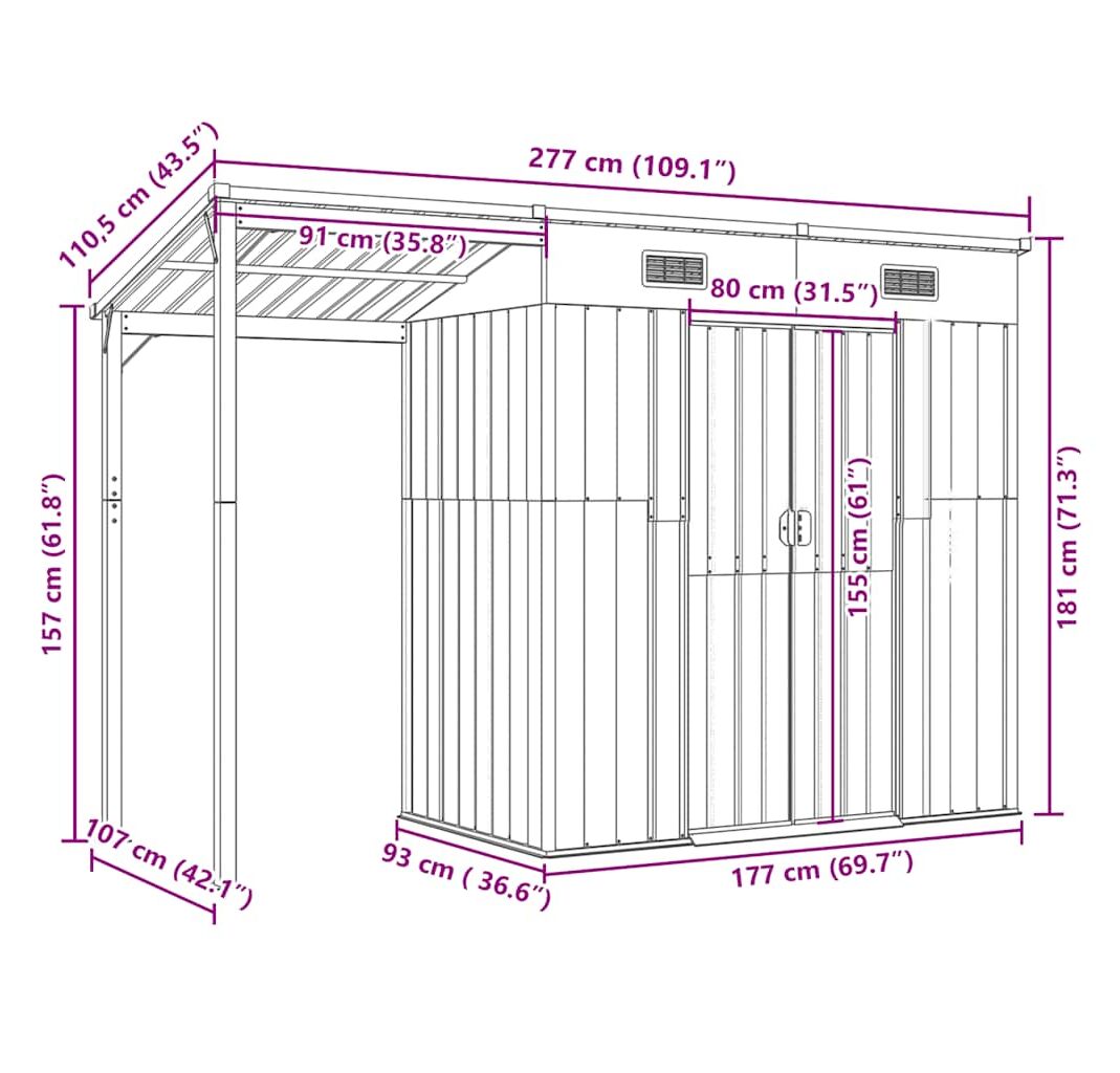 - Dimensiuni exterioare șopron: 177 x 93 x 157/181 cm (l x ad. x î))
