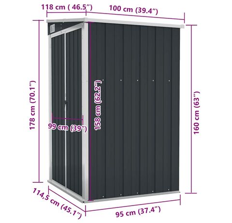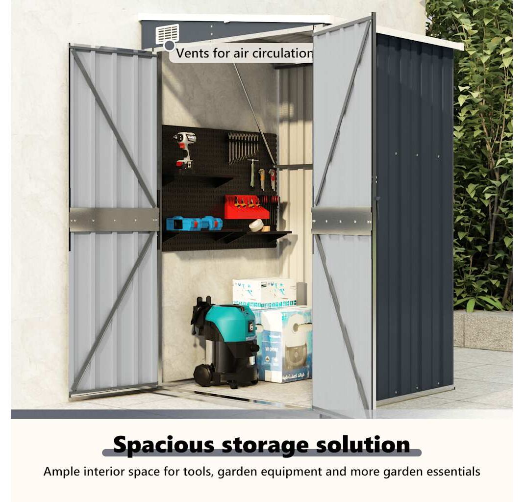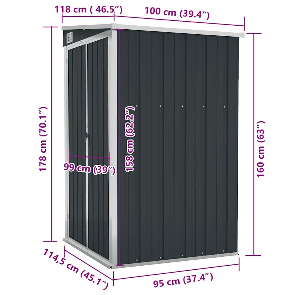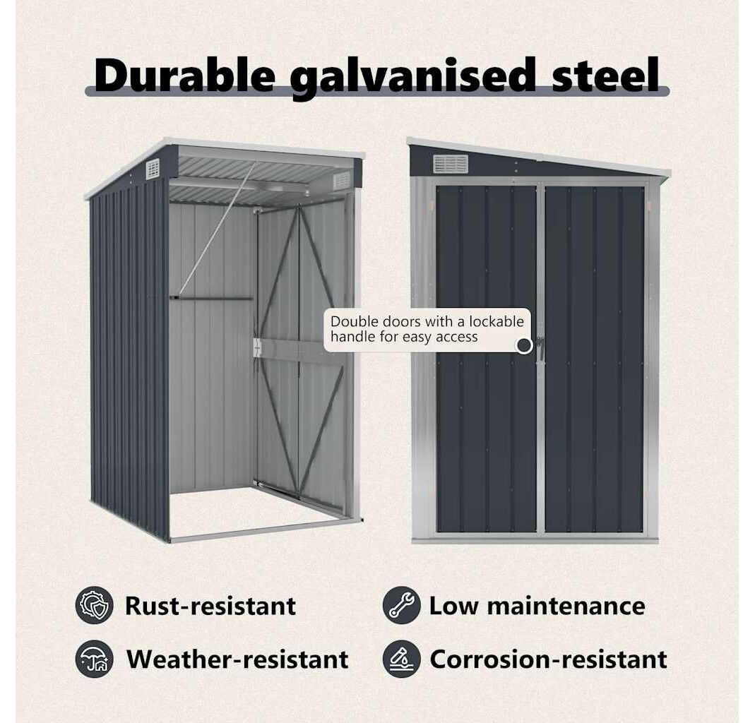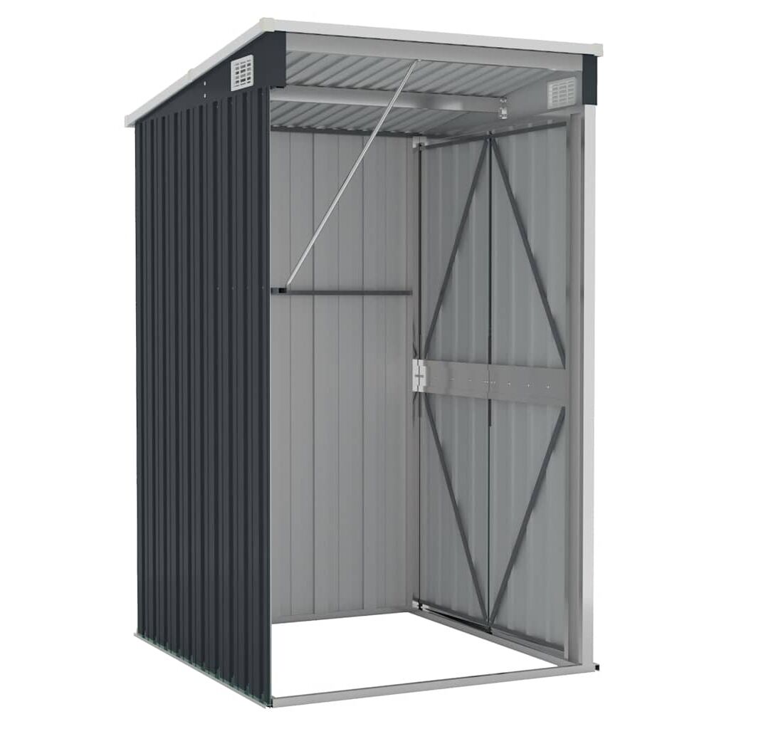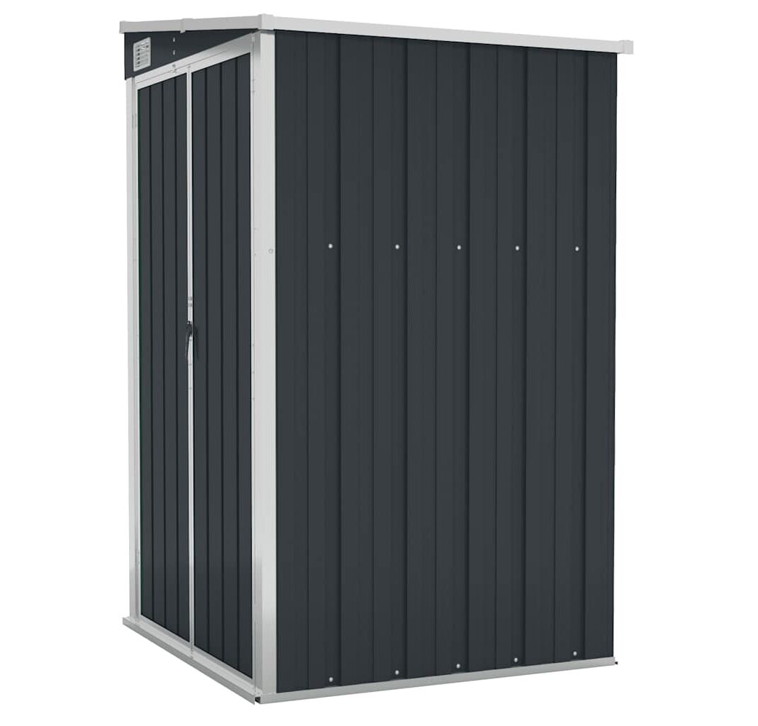 Deoarece este construită din oțel galvanizat și metal, magazia necesită o întreținere minimă și este foarte durabilă. Ușile cu deschidere dublă din față permit intrarea și ieșirea ușoară. Mânerul din plastic cu funcție de blocare asigură siguranța obiectelor dumneavoastră. În plus, apa de ploaie se scurge automat de pe acoperiș datorită designului înclinat.