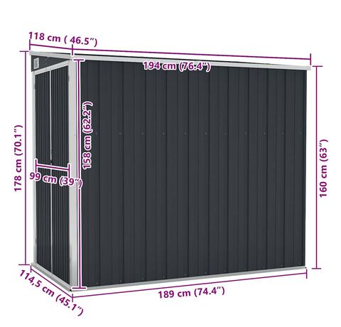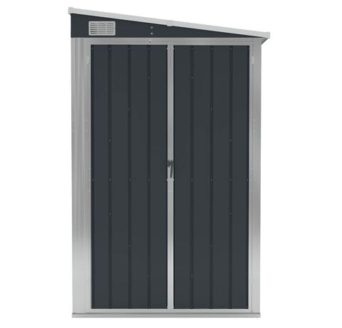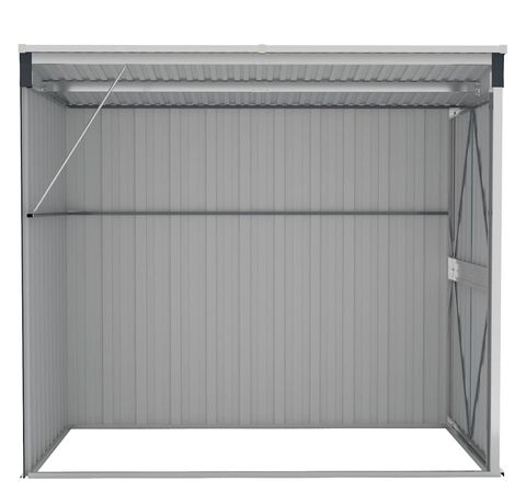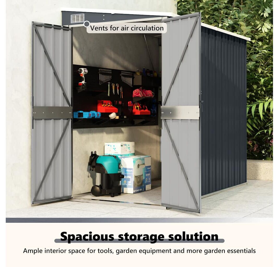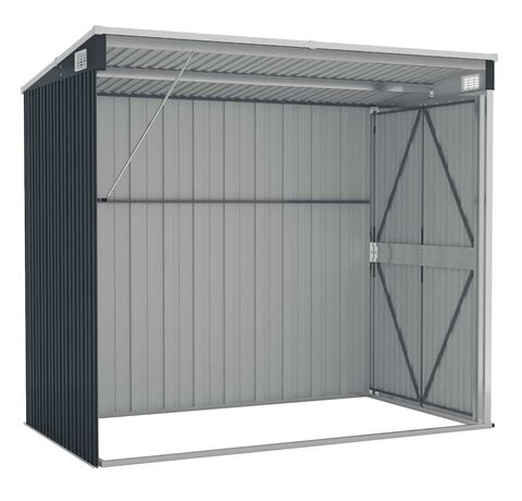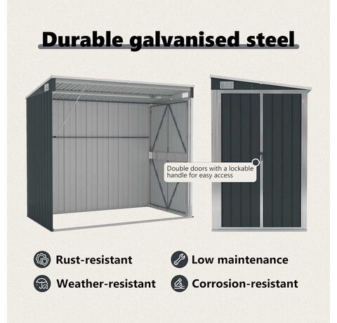 Deoarece este construită din oțel galvanizat și metal, magazia necesită o întreținere minimă și este foarte durabilă. Ușile cu deschidere dublă din față permit intrarea și ieșirea ușoară. Mânerul din plastic cu funcție de blocare asigură siguranța obiectelor dumneavoastră. În plus, apa de ploaie se scurge automat de pe acoperiș datorită designului înclinat.