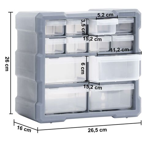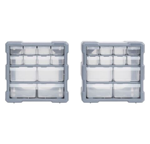 Fiecare unitate de depozitare conține 8 sertare mici și 4 sertare medii, pentru diferite necesități. Dulapurile pot păstra organizate și la îndemână unelte de mână și accesorii, precum elementele de fixare. Dulapul pentru scule este fabricat din plastic rezistent la impact, care este atât durabil, cât și stabil. Sertarele sunt realizate din plastic transparent, astfel încât să puteți identifica rapid conținutul. Această cutie de lucru este ideală pentru depozitarea piulițelor, șuruburilor, bolțurilor, cuielor, diverselor componente și elementelor de fixare.