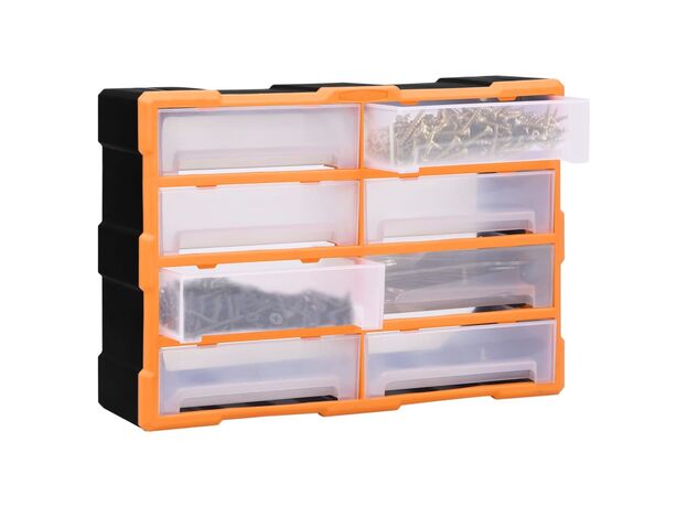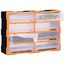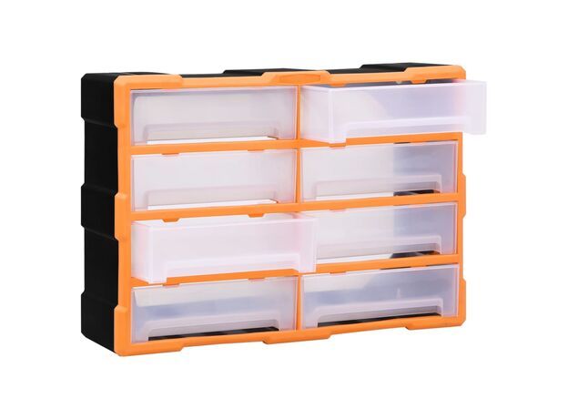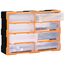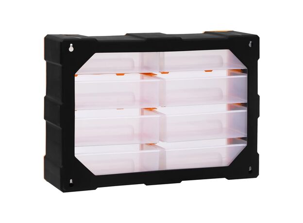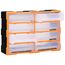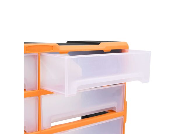 Această unitate de depozitare conține 18 sertare medii, pentru nevoile dvs. zilnice. Ele vă mențin organizate și la îndemână uneltele de mână și accesoriile mai mici, precum elementele de fixare. Dulapul pentru unelte este fabricat din plastic rezistent la impact, care este deopotrivă durabil și stabil. Sertarele sunt realizate din plastic transparent, astfel încât să puteți identifica rapid conținutul. Această cutie de lucru este ideală pentru depozitarea piulițelor, șuruburilor, bolțurilor, cuielor, elementelor de fixare și a altor componente diverse.