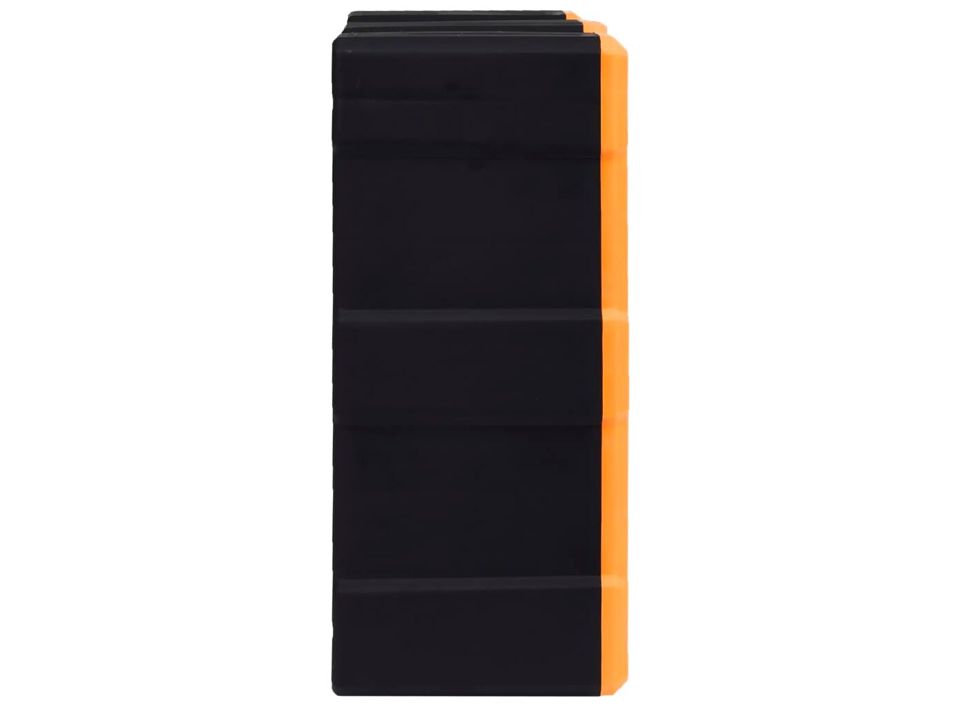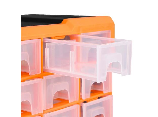 Această unitate de depozitare conține 18 sertare medii, pentru nevoile dvs. zilnice. Ele vă mențin organizate și la îndemână uneltele de mână și accesoriile mai mici, precum elementele de fixare. Dulapul pentru unelte este fabricat din plastic rezistent la impact, care este deopotrivă durabil și stabil. Sertarele sunt realizate din plastic transparent, astfel încât să puteți identifica rapid conținutul. Această cutie de lucru este ideală pentru depozitarea piulițelor, șuruburilor, bolțurilor, cuielor, elementelor de fixare și a altor componente diverse.