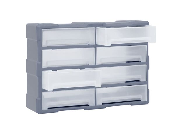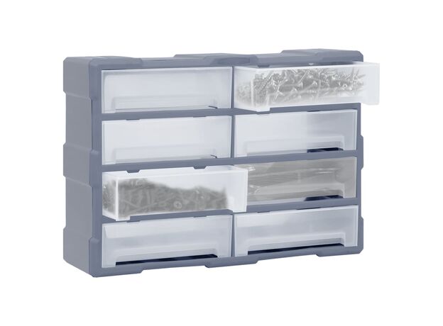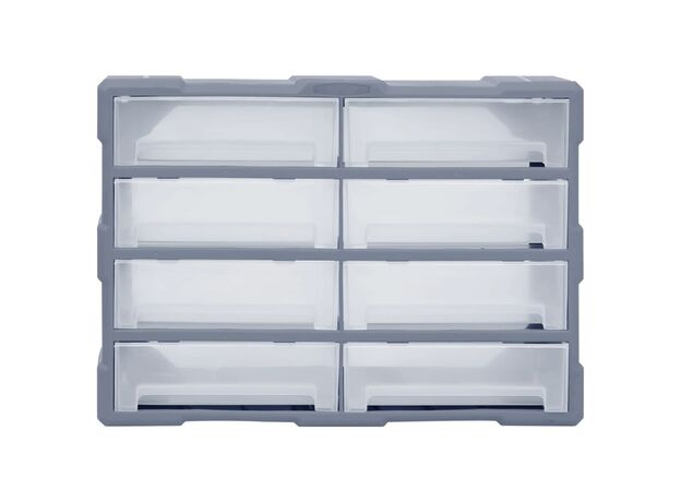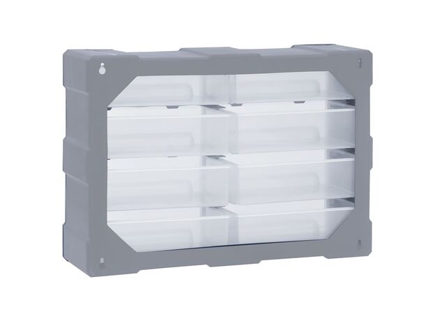 Această unitate de depozitare conține 18 sertare medii, pentru nevoile dvs. zilnice. Ele vă mențin organizate și la îndemână uneltele de mână și accesoriile mai mici, precum elementele de fixare. Dulapul pentru unelte este fabricat din plastic rezistent la impact, care este deopotrivă durabil și stabil. Sertarele sunt realizate din plastic transparent, astfel încât să puteți identifica rapid conținutul. Această cutie de lucru este ideală pentru depozitarea piulițelor, șuruburilor, bolțurilor, cuielor, elementelor de fixare și a altor componente diverse.