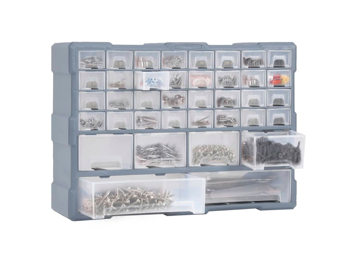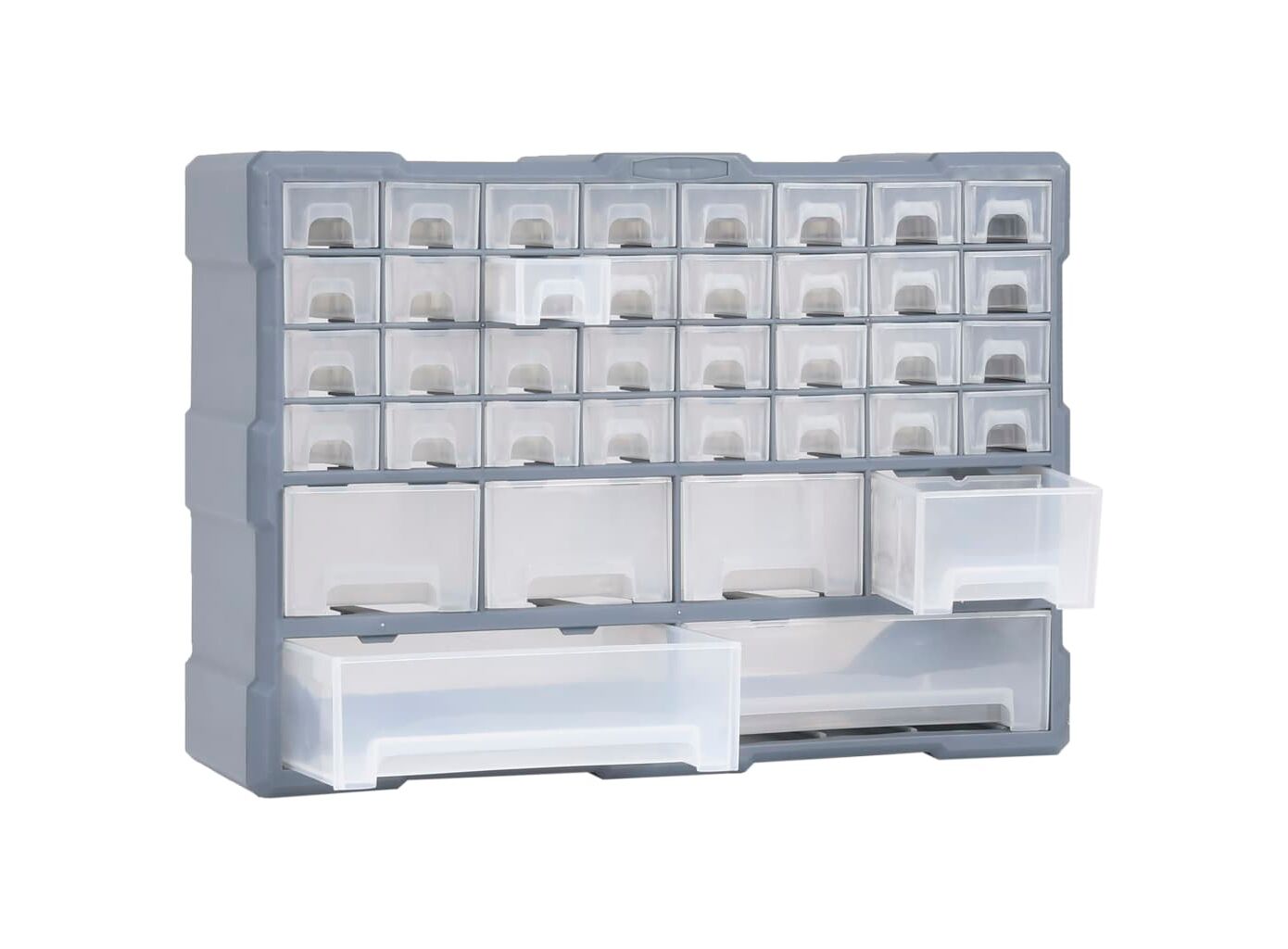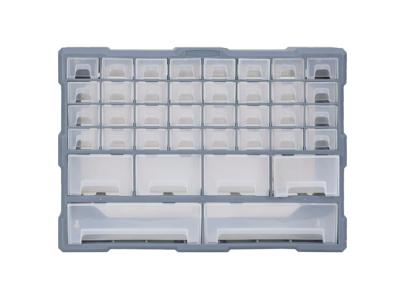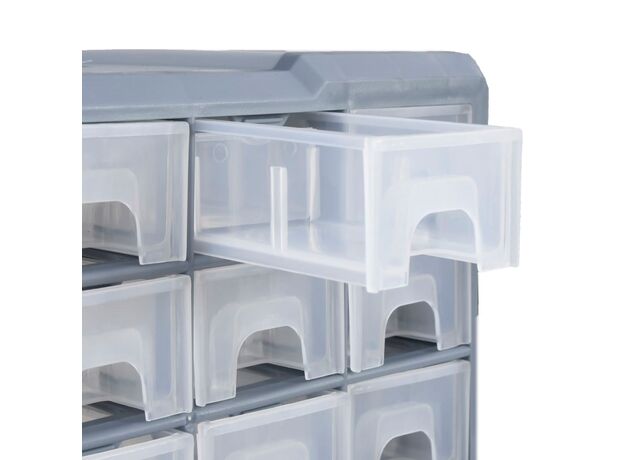 Această unitate de depozitare conține 18 sertare medii, pentru nevoile dvs. zilnice. Ele vă mențin organizate și la îndemână uneltele de mână și accesoriile mai mici, precum elementele de fixare. Dulapul pentru unelte este fabricat din plastic rezistent la impact, care este deopotrivă durabil și stabil. Sertarele sunt realizate din plastic transparent, astfel încât să puteți identifica rapid conținutul. Această cutie de lucru este ideală pentru depozitarea piulițelor, șuruburilor, bolțurilor, cuielor, elementelor de fixare și a altor componente diverse.