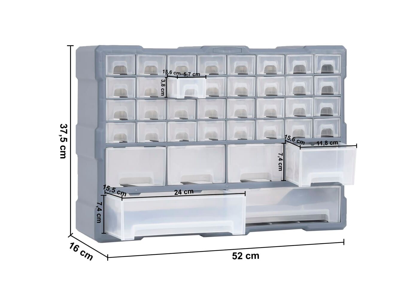 Cantitatea minima pentru "Organizator cu 38 de sertare, 52 x 16 x 37,5 cm" este 1.