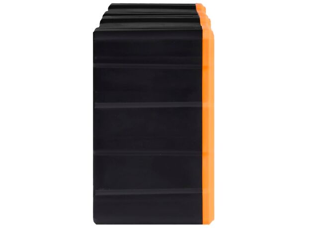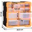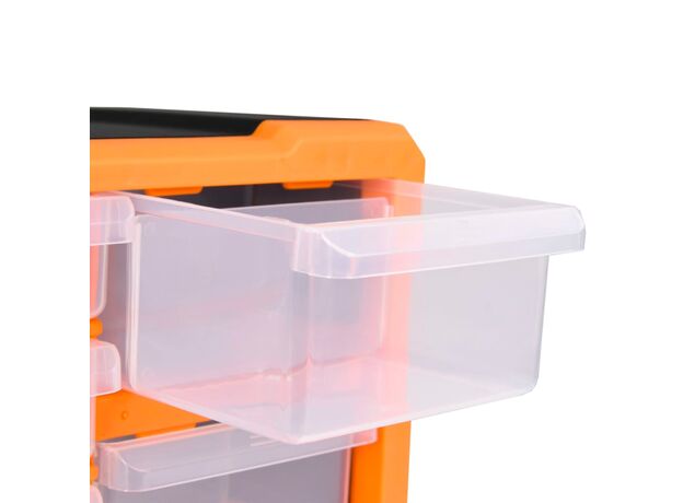 Această unitate de depozitare conține 18 sertare medii, pentru nevoile dvs. zilnice. Ele vă mențin organizate și la îndemână uneltele de mână și accesoriile mai mici, precum elementele de fixare. Dulapul pentru unelte este fabricat din plastic rezistent la impact, care este deopotrivă durabil și stabil. Sertarele sunt realizate din plastic transparent, astfel încât să puteți identifica rapid conținutul. Această cutie de lucru este ideală pentru depozitarea piulițelor, șuruburilor, bolțurilor, cuielor, elementelor de fixare și a altor componente diverse.