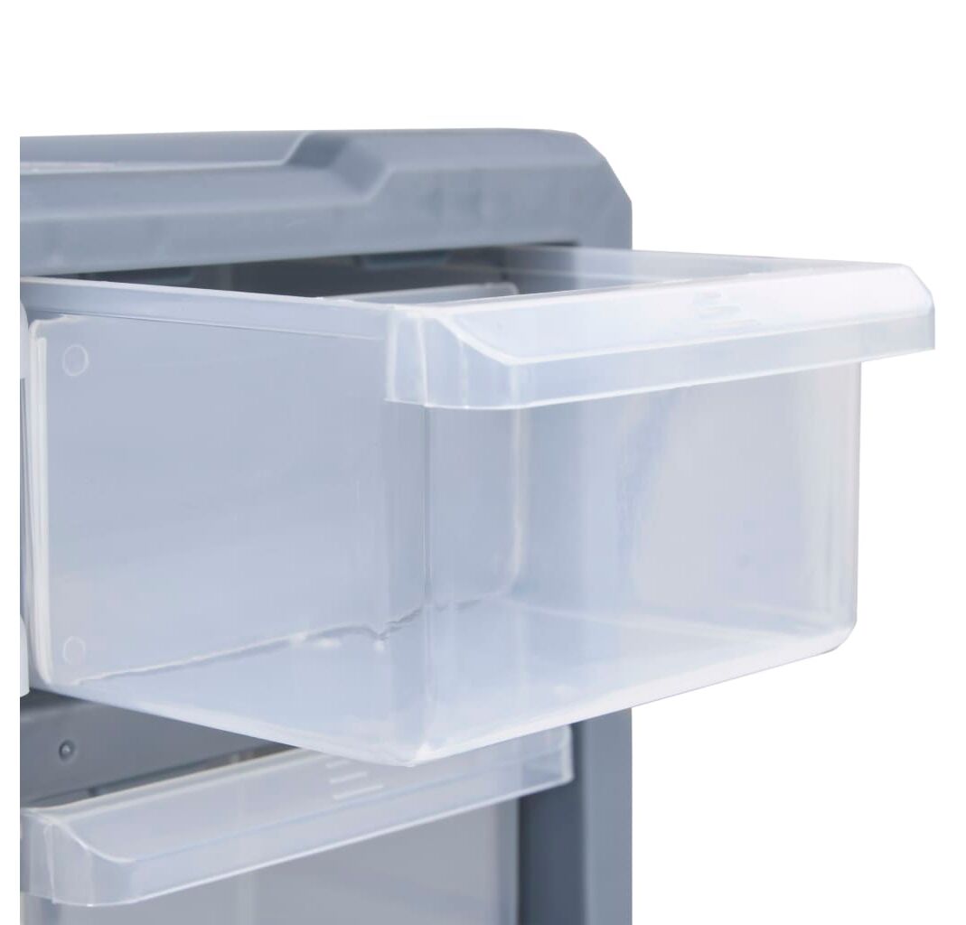 Această unitate de depozitare conține 14 sertare mici și 8 sertare medii, pentru diferitele dvs. nevoi. Ele vă mențin organizate și la îndemână instrumentele manuale și accesoriile mai mici, precum elementele de fixare. Dulapul pentru scule este fabricat din plastic rezistent la impact, care este deopotrivă durabil și stabil. Sertarele sunt realizate din plastic transparent, astfel încât să puteți identifica rapid conținutul. Această cutie de lucru este ideală pentru depozitarea piulițelor, șuruburilor, bolțurilor, cuielor, elementelor de fixare și pentru alte componente diverse.