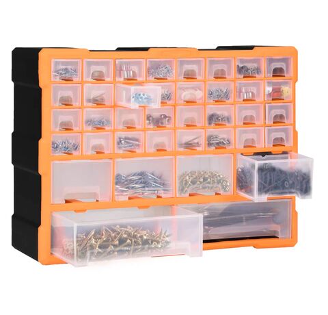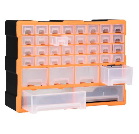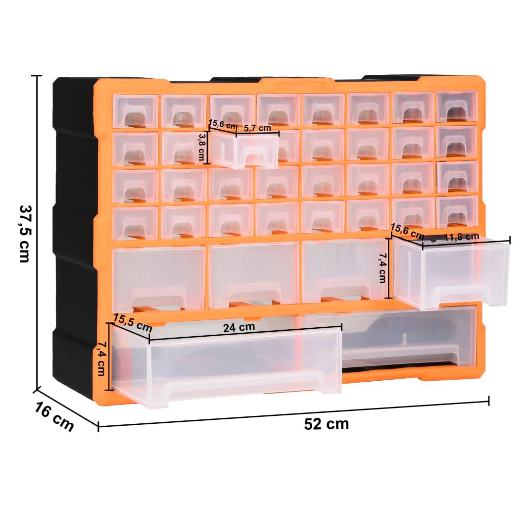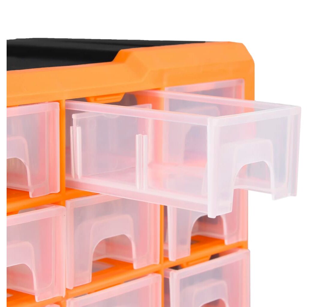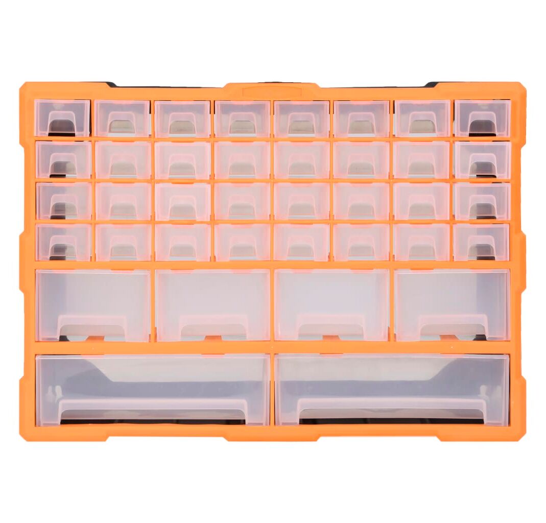 Această unitate de depozitare conține 32 sertare mici, 4 sertare medii și 2 sertare mari, pentru diferitele dvs. nevoi. Ele vă mențin organizate și la îndemână instrumentele manuale și accesoriile mai mici, precum elementele de fixare. Dulapul pentru scule este fabricat din plastic rezistent la impact, care este deopotrivă durabil și stabil. Sertarele sunt realizate din plastic transparent, astfel încât să puteți identifica rapid conținutul. Această cutie de lucru este ideală pentru depozitarea piulițelor, șuruburilor, bolțurilor, cuielor, elementelor de fixare și pentru alte componente diverse.