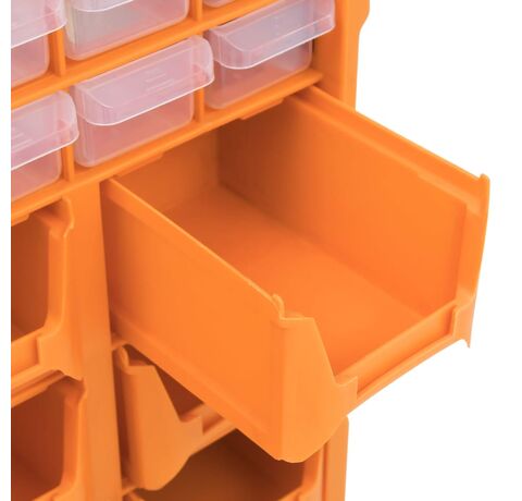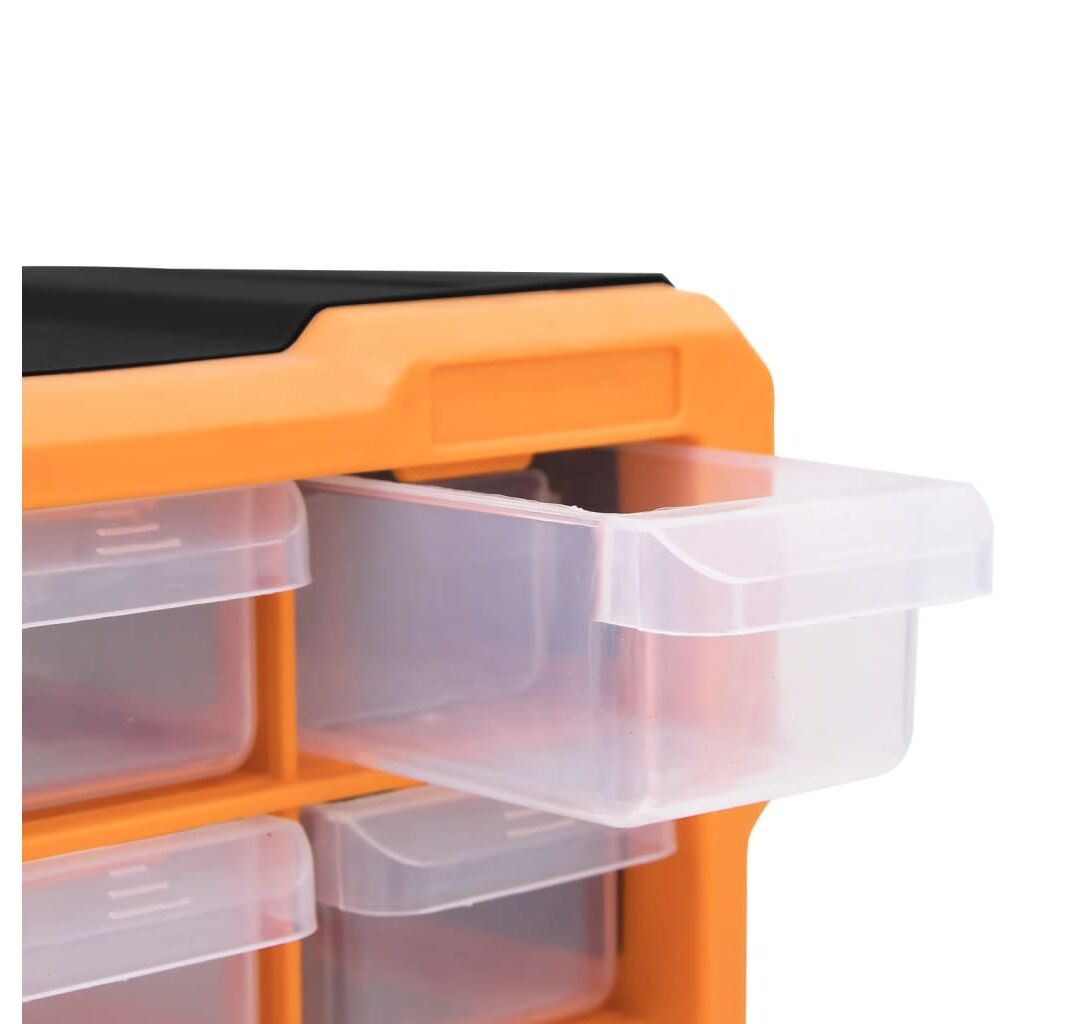 Această unitate de depozitare conține 30 sertare mici și 9 sertare deschise, pentru diferitele dvs. nevoi. Ele vă mențin organizate și la îndemână uneltele de mână și accesoriile mai mici, precum elementele de fixare. Dulapul pentru unelte este fabricat din plastic rezistent la impact, care este deopotrivă durabil și stabil. Sertarele sunt realizate din plastic transparent, astfel încât să puteți identifica rapid conținutul. Această cutie de lucru este ideală pentru depozitarea piulițelor, șuruburilor, bolțurilor, cuielor, elementelor de fixare și pentru alte componente diverse.