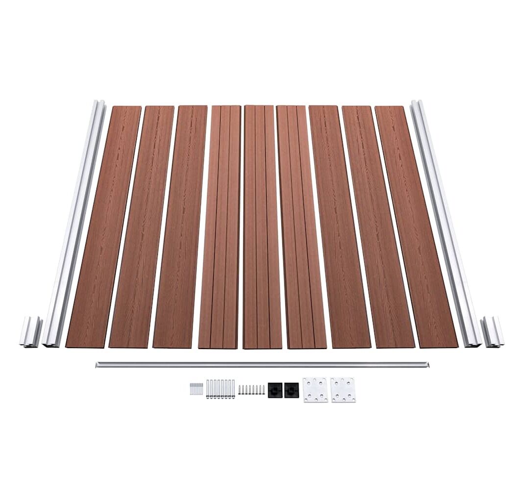 - Material: WPC (compozit lemn-plastic), aluminiu, oțel