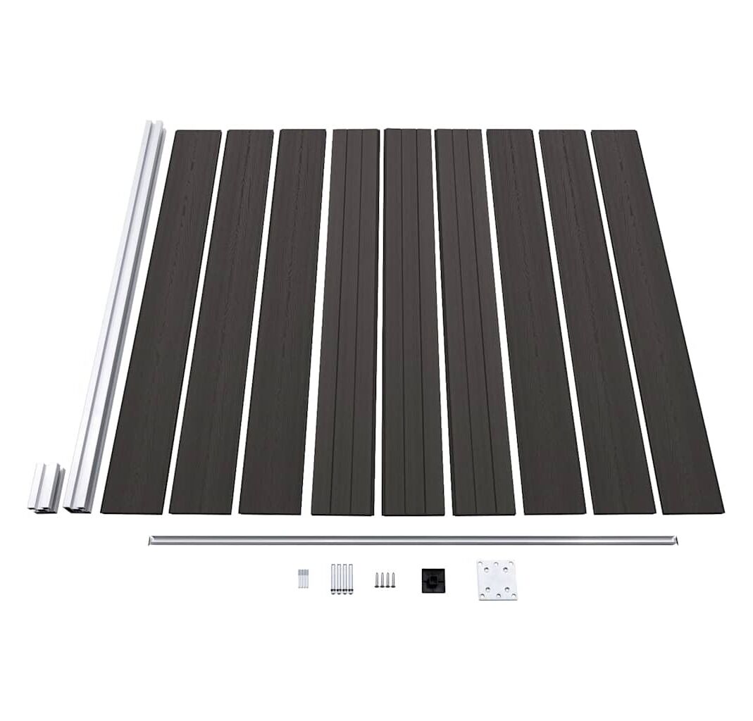- Material: WPC (compozit lemn-plastic), aluminiu, oțel