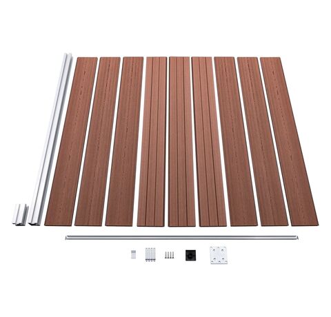 - Material: WPC (compozit lemn-plastic), aluminiu, oțel