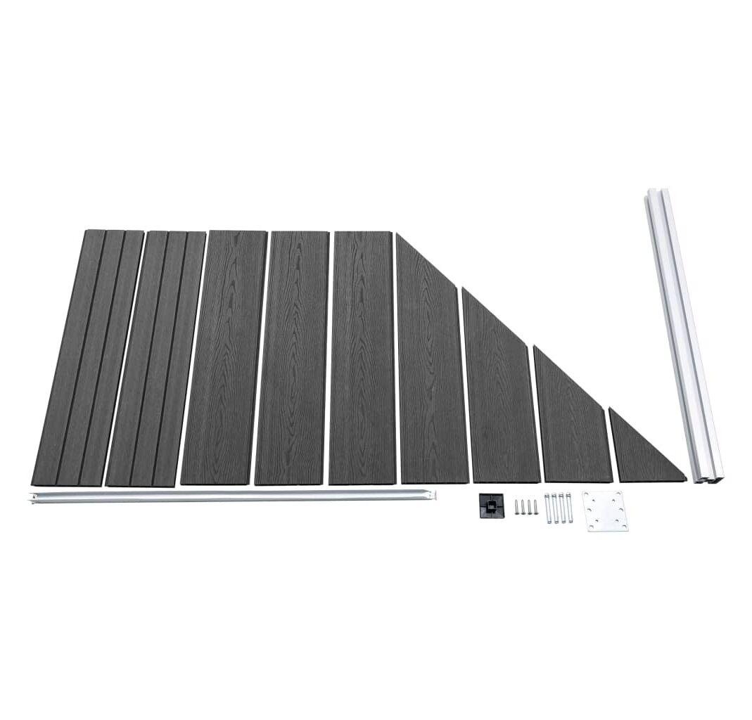 - Material: WPC (compozit lemn-plastic), aluminiu, oțel