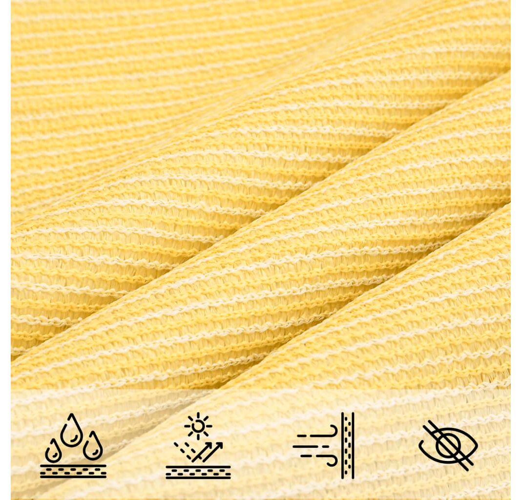 Pânza de parasolar, fabricată din HDPE 100% (polietilenă de înaltă densitate), vă protejează de lumina directă a soarelui, permite un flux suficient de aer și este permeabilă la apă. Materialul HDPE este tratat special, deci este rezistent la mucegai și la raze UV. Parasolarul este ușor de asamblat, datorită elementelor de fixare din oțel inoxidabil la fiecare colț, și a funiilor incluse.