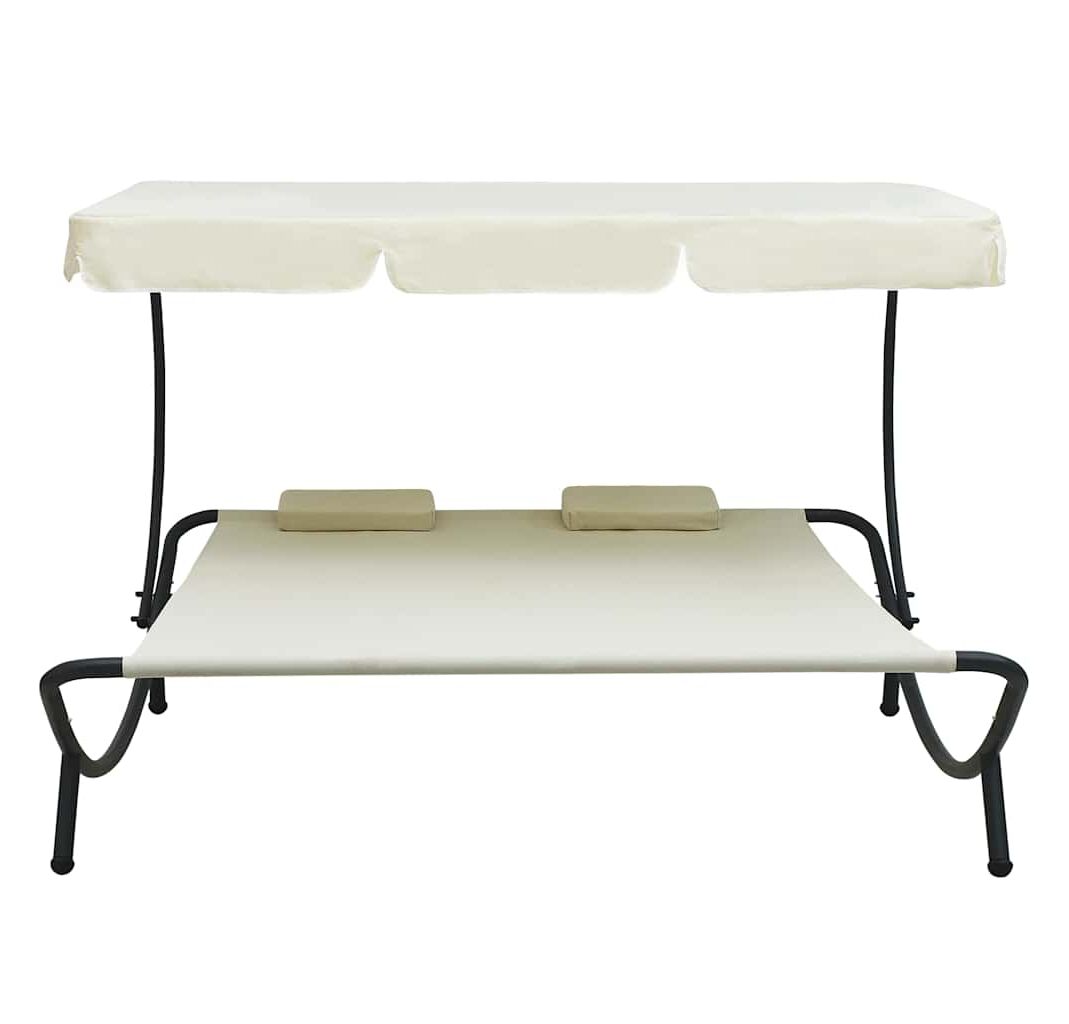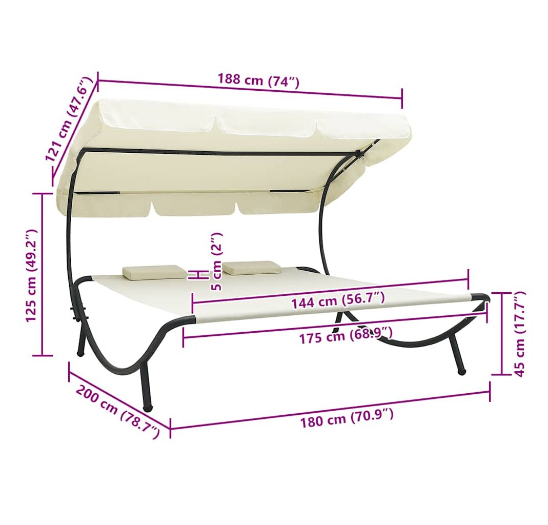 Acest pat șezlong dublu, împreună cu cele 2 perne și o copertină mare, va atrage atenția indiferent de locul unde va fi amplasat. Este o alegere perfectă pentru a vă relaxa sau distra cu familia în grădină, curte, pe verandă sau la plajă.