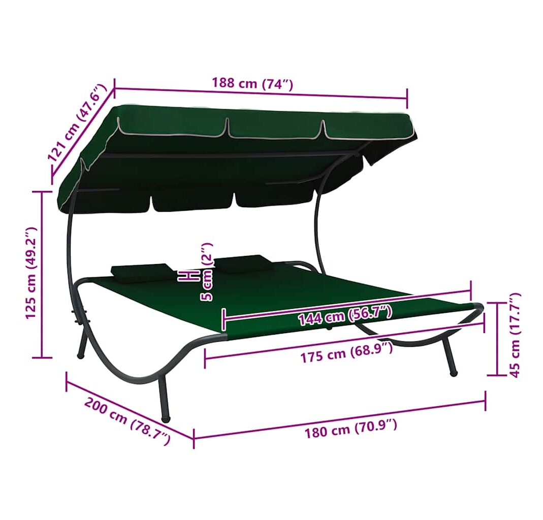 Acest pat șezlong dublu, care include 2 perne și un baldachin mare, va fi un punct de atracție indiferent de locul unde va fi amplasat. Este o alegere perfectă pentru a vă relaxa sau distra cu familia în grădină, curte, pe terasă sau la plajă.