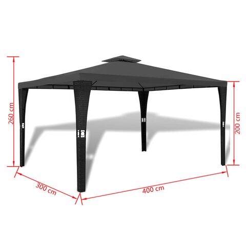 Cadrul este realizat din oțel vopsit electrostatic, rezistent la rugină și cu o greutate redusă. Modelul de împletitură din răchită conferă pavilionului un aspect elegant și atrăgător. Acoperișul este fabricat din poliester rezistent la raze UV și la rupere, fiind de asemenea impermeabil și foarte durabil. Construcția acoperișului cu vârf dublu permite circulația aerului într-o zi fierbinte. Acest foișor este foarte durabil.