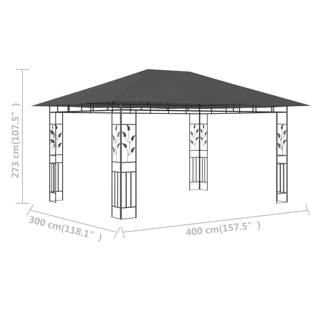 Cadrul prezintă o construcție metalică robustă, care îl face durabil și stabil. Acoperișul din material textil vă protejează de soarele arzător, ajutându-vă să vă bucurați de un confort sporit în timpul activităților în aer liber. Acest cort, echipat cu plase anti-țânțari, vă protejează de insecte și țânțari. Astfel, vă puteți bucura de timpul petrecut afară, fără să fiți deranjați. De asemenea, acest foișor poate fi montat într-un timp scurt. Foișorul nostru este ușor de asamblat.