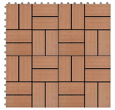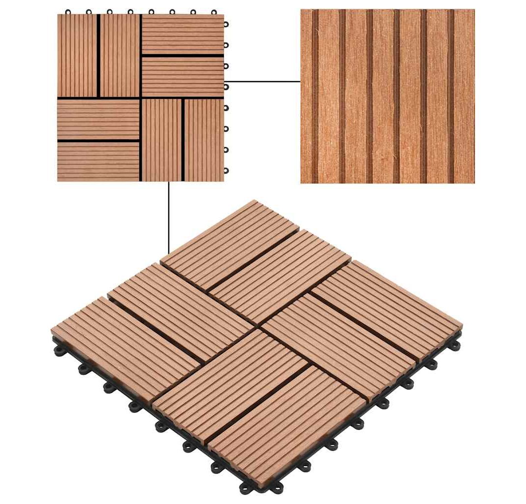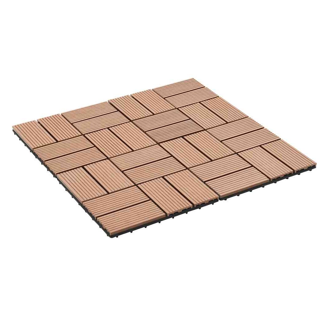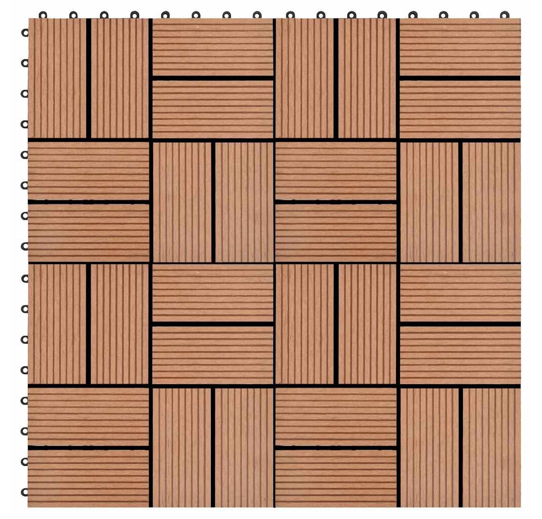 Setul nostru de plăci de pardoseală din WPC (lemn compozit), cu dimensiuni ale plăcii de 30 x 30 cm, este format din 11 bucăți și va acoperi o suprafață totală de 1 metru pătrat. Acest set va fi perfect pentru terasă, balcon, baie, zona de la piscină sau de la spa.