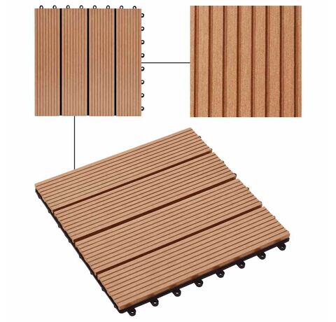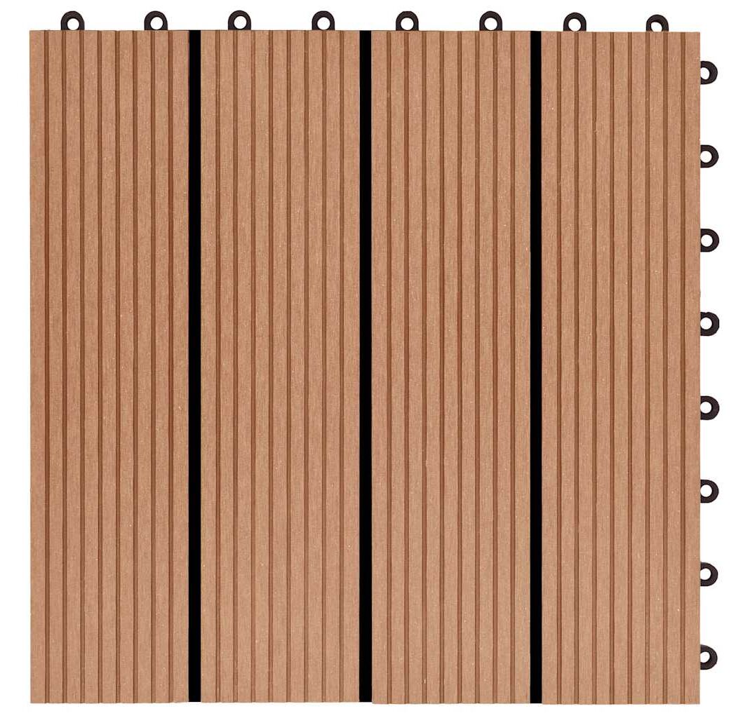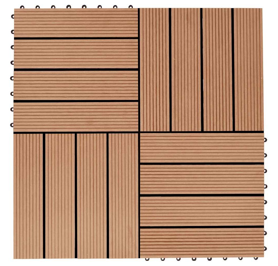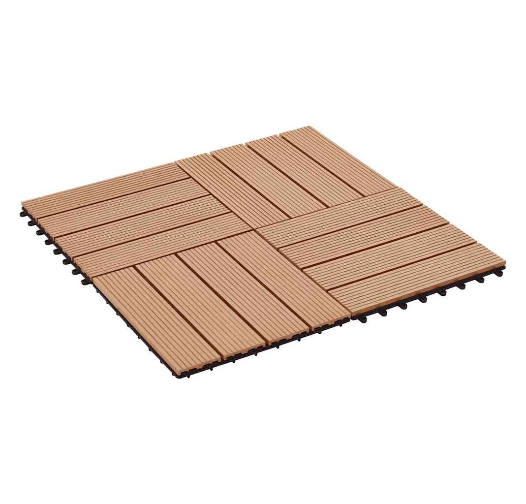Setul nostru de plăci de pardoseală din WPC (lemn compozit), cu dimensiuni ale plăcii de 30 x 30 cm, este format din 11 bucăți și va acoperi o suprafață totală de 1 metru pătrat. Acest set va fi perfect pentru terasă, balcon, baie, zona de la piscină sau de la spa.