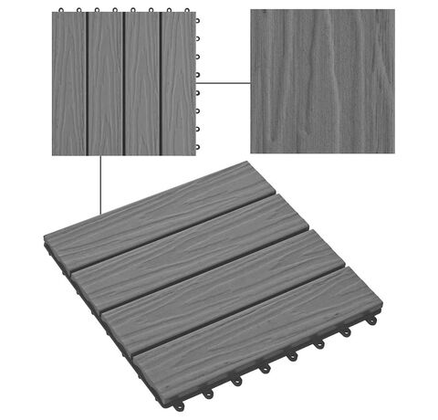 Setul de plăci de pardoseală în relief din WPC, cu o dimensiune a plăcii de 30 x 30 cm, este format din 11 piese și va acoperi o suprafață totală de 1 metru pătrat. Acestea vor oferi un aspect curat curții, balconului, băii, piscinei sau zonei de spa.