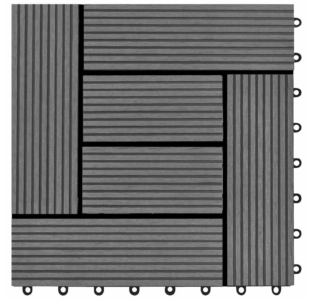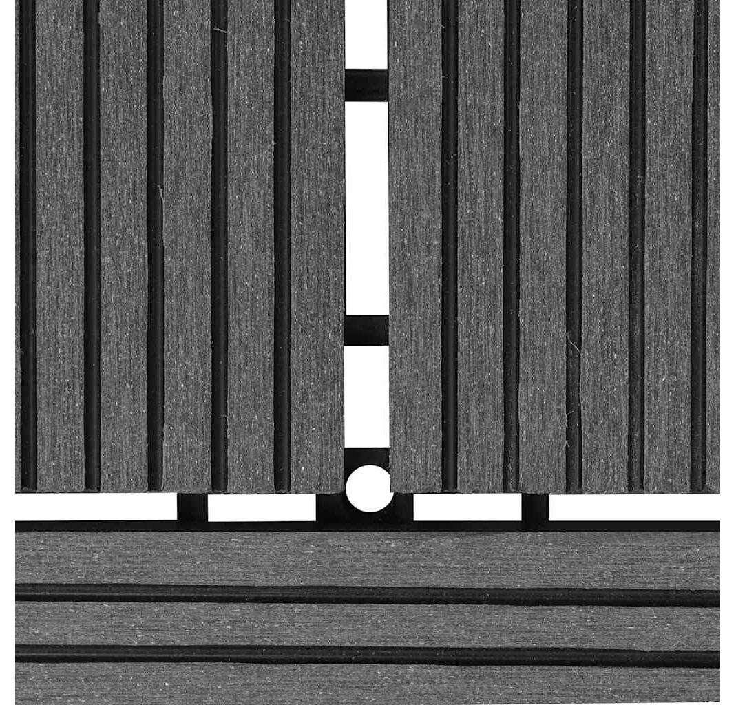 Aceste plăci din WPC, fiecare cu dimensiunea de 30 x 30 cm și în număr de 11, pot acoperi o suprafață de 1 mp. Sunt potrivite pentru terase, balcoane, băi sau orice loc aflat în apropierea unei piscine sau centru spa.