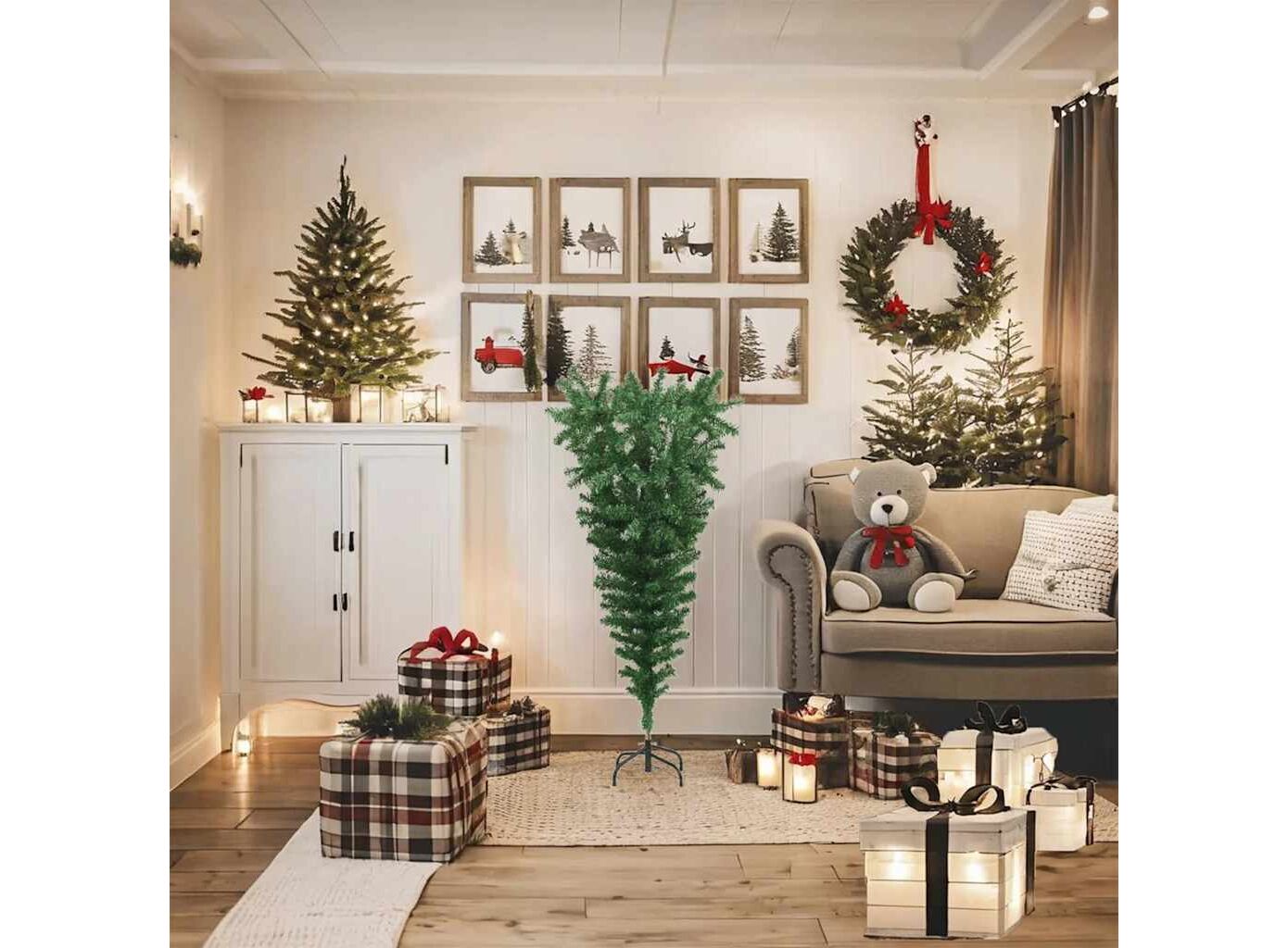 Acest frumos pom de Crăciun artificial inversat este foarte realist prin forma și aspectul său, creând o atmosferă potrivită pentru Crăciun.