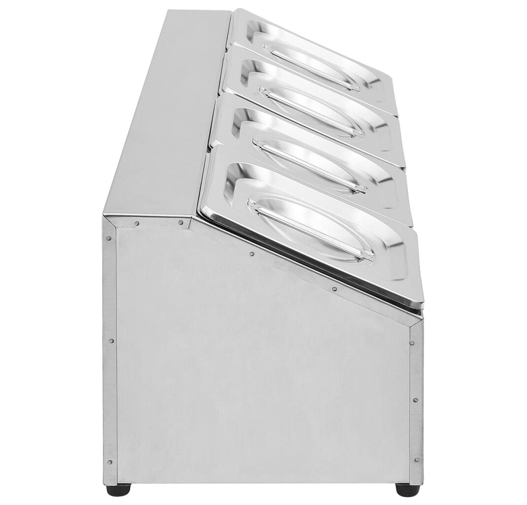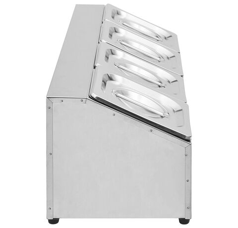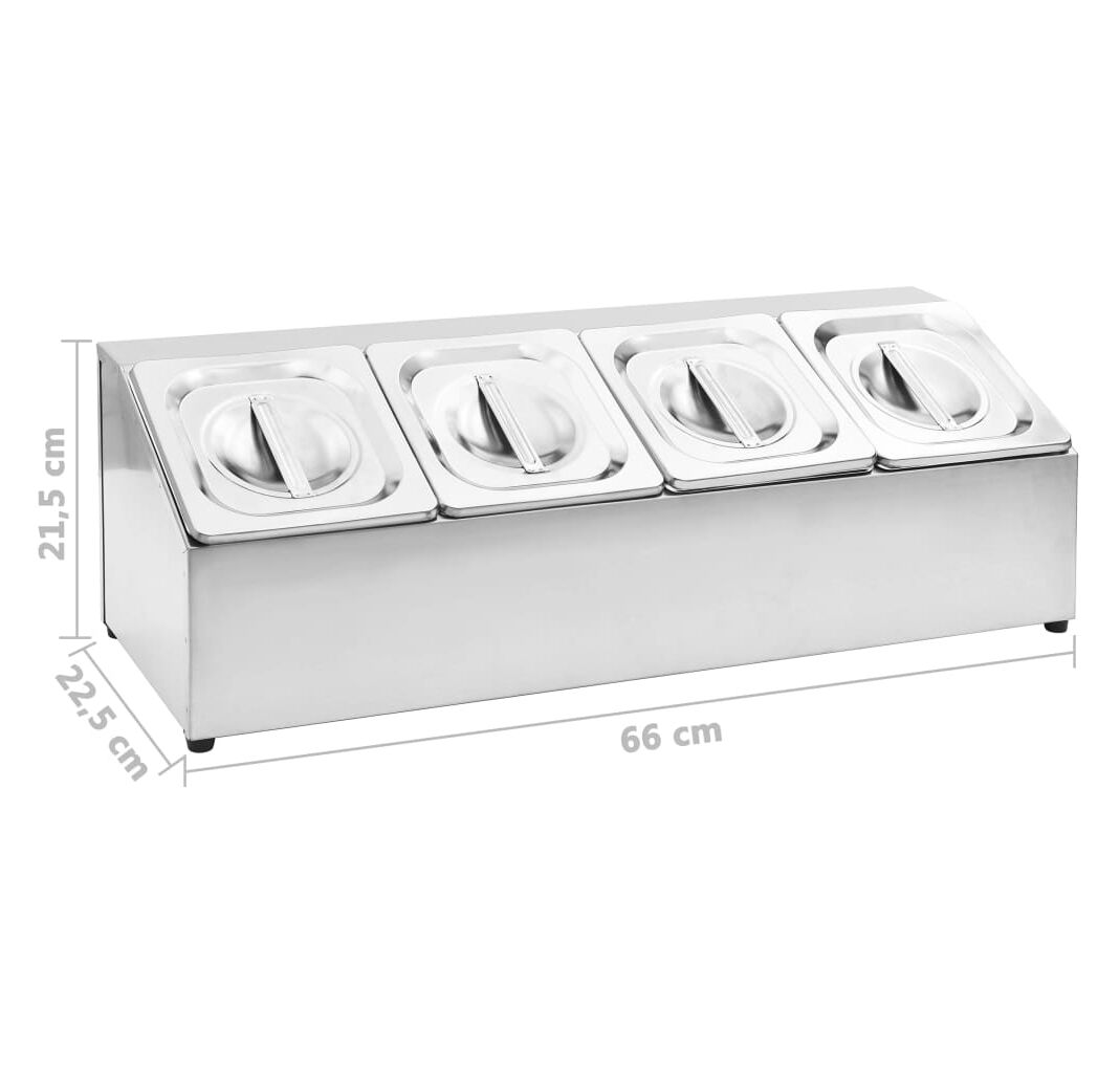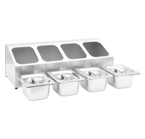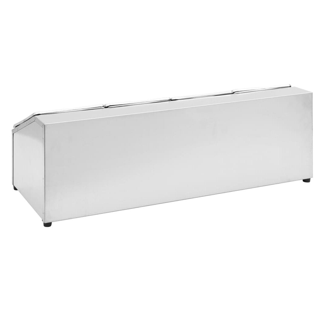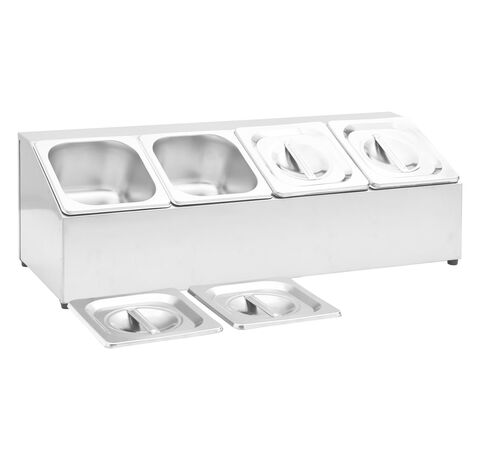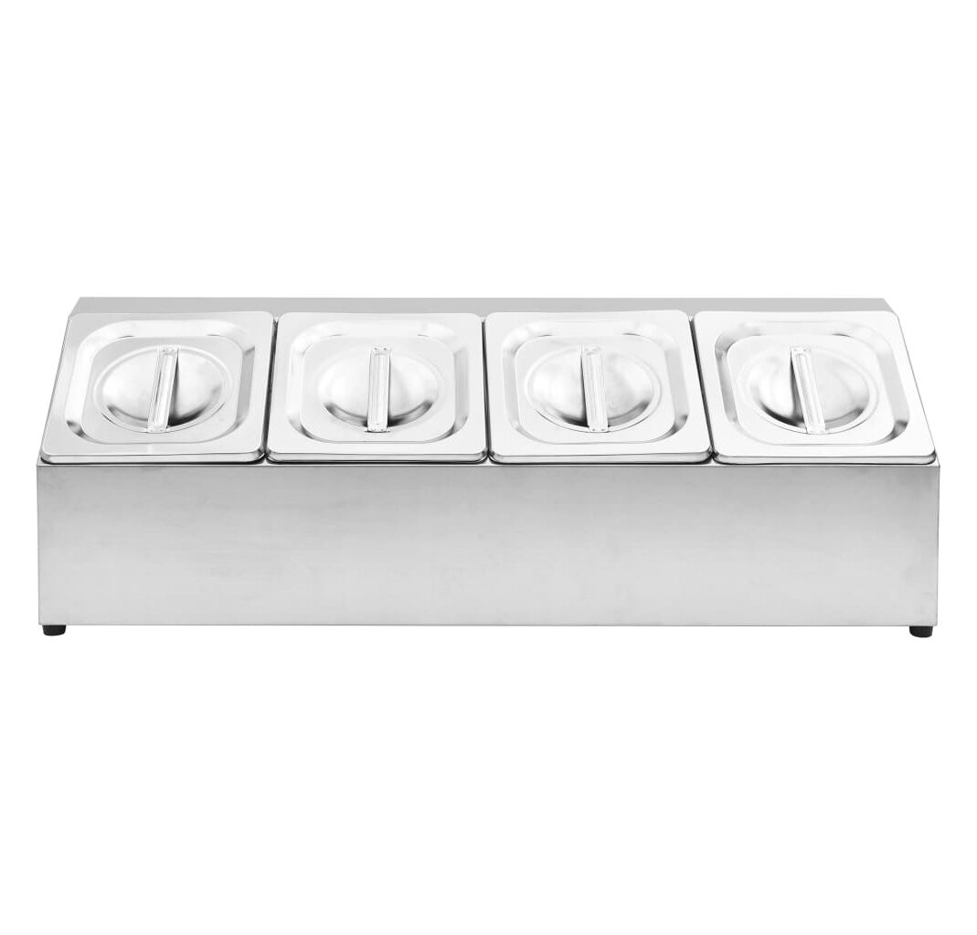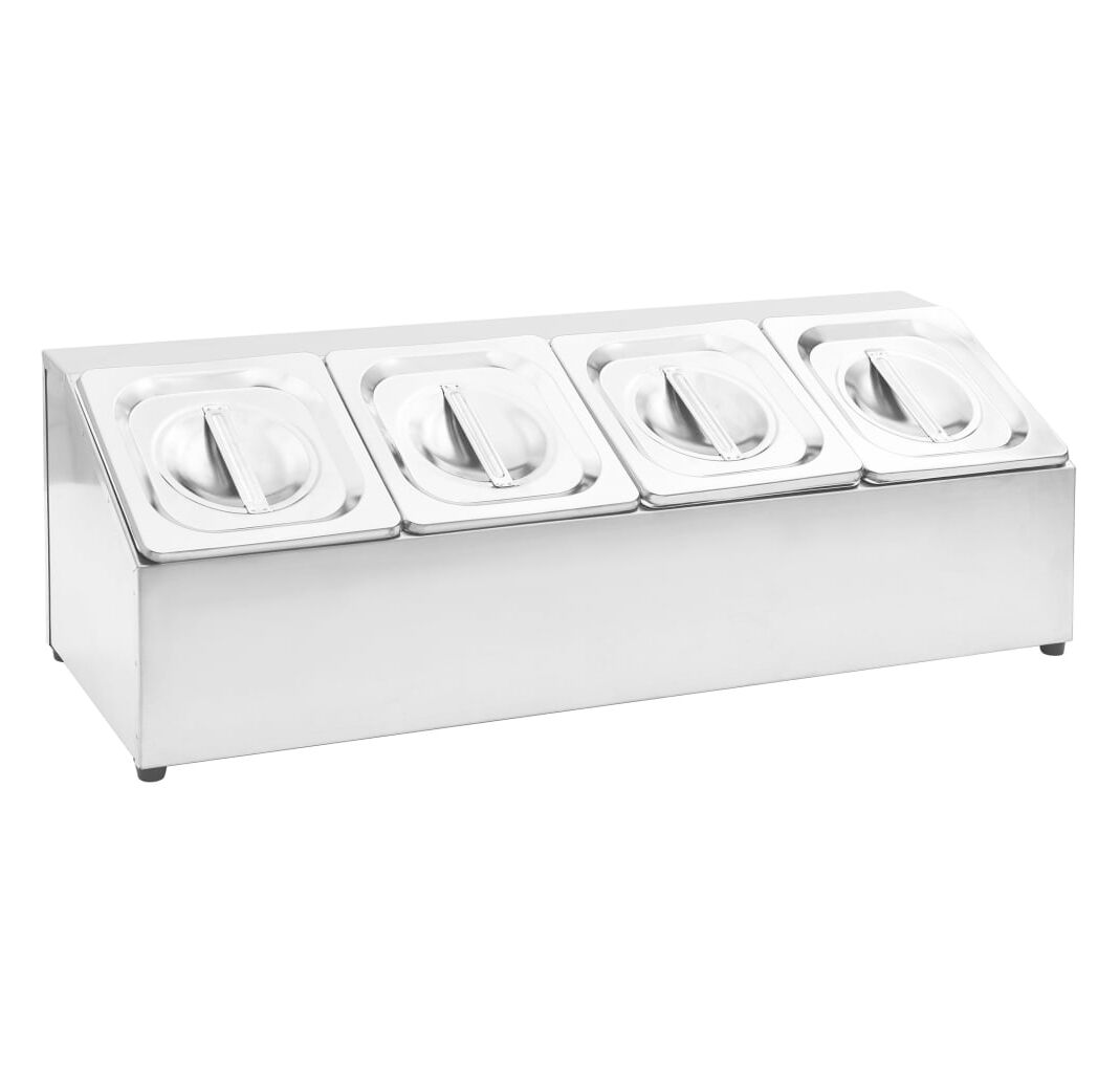 Acest recipient pentru salate, fabricat din oțel inoxidabil, este sigur pentru mașina de spălat vase și ușor de curățat. Picioarele de cauciuc antiderapant garantează un suport stabil și protejează suprafața de lucru de zgârieturi. Acest suport de salate include, de asemenea, 4 recipiente GN 1/6, care pot fi separate, pentru umplere și golire ușoară. În plus, sunt incluse capace potrivite pentru a menține conținutul proaspăt, sigur și fără dăunători.