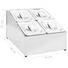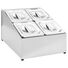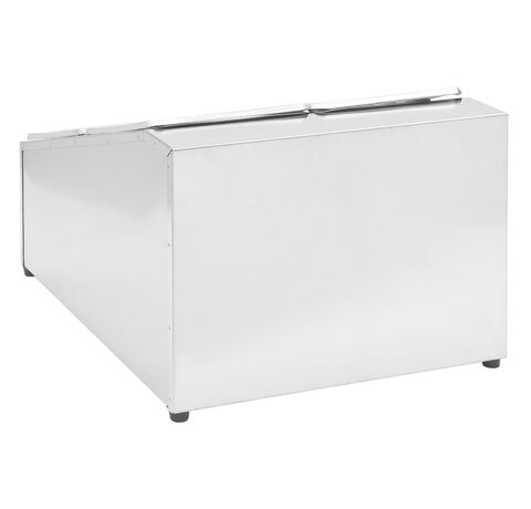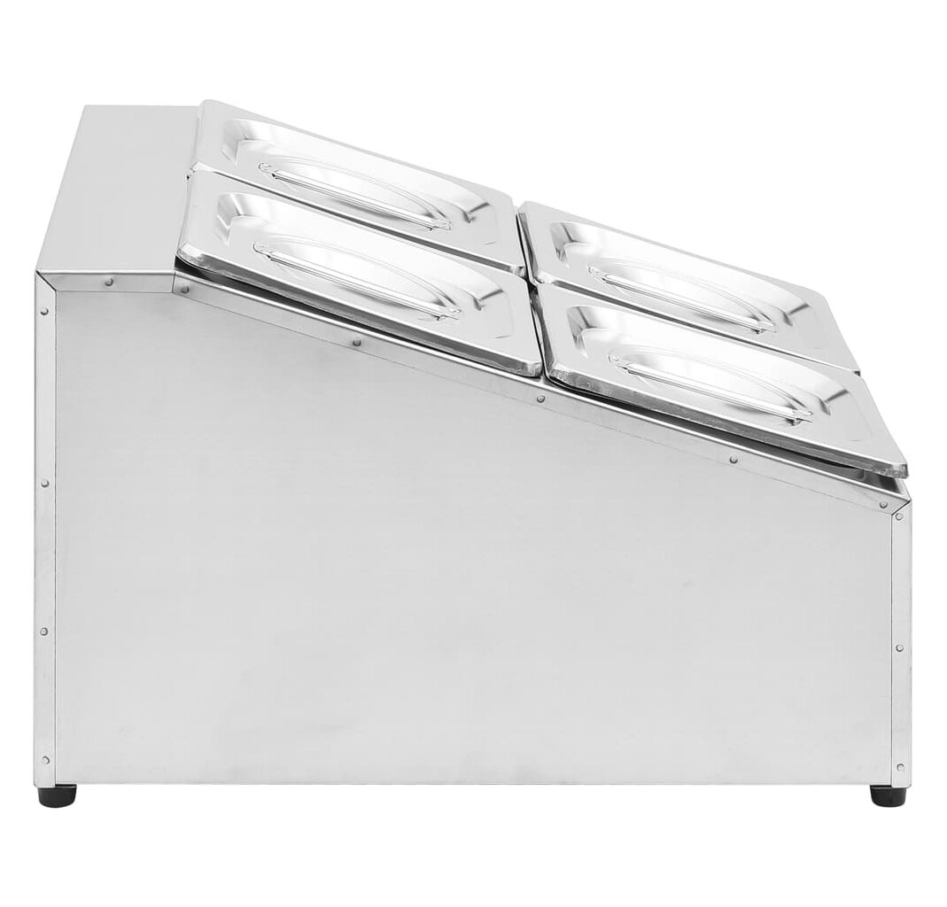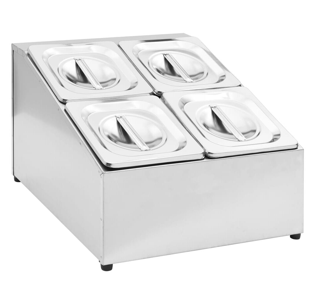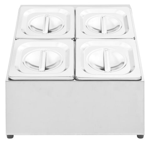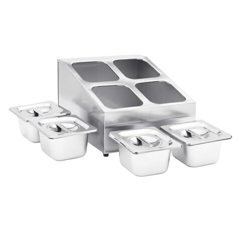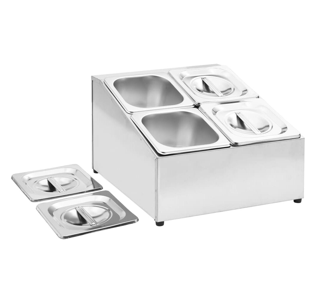 Acest recipient pentru salate, fabricat din oțel inoxidabil, este sigur pentru mașina de spălat vase și ușor de curățat. Picioarele de cauciuc antiderapant garantează un suport stabil și protejează suprafața de lucru de zgârieturi. Acest suport de salate include, de asemenea, 4 recipiente GN 1/6, care pot fi separate, pentru umplere și golire ușoară. În plus, sunt incluse capace potrivite pentru a menține conținutul proaspăt, sigur și fără dăunători.