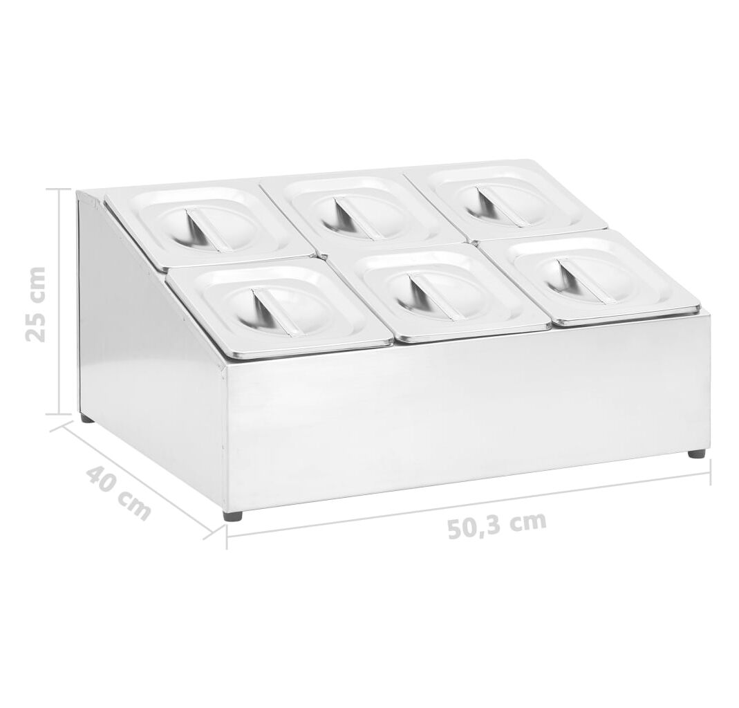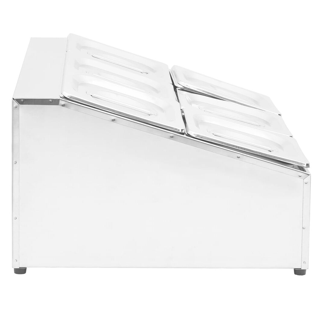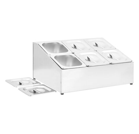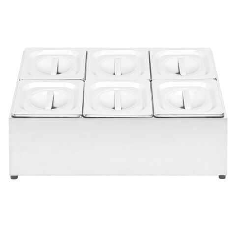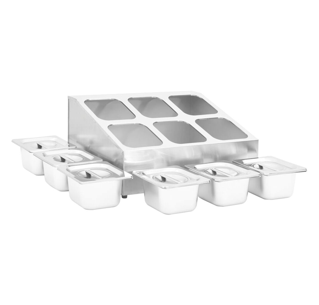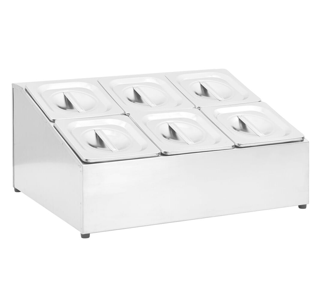 Acest recipient pentru salate, fabricat din oțel inoxidabil, este sigur pentru mașina de spălat vase și ușor de curățat. Picioarele din cauciuc antiderapant garantează un suport stabil și protejează suprafața de lucru de zgârieturi. Acest suport de salate include, de asemenea, 6 recipiente GN 1/6, care pot fi separate, pentru umplere și golire ușoară. În plus, sunt incluse capace potrivite pentru a menține conținutul proaspăt, sigur și fără dăunători.