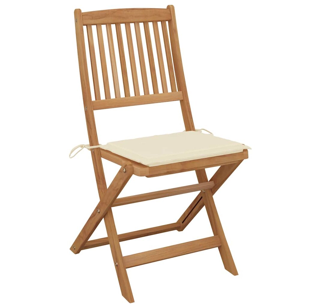 Aceste scaune de grădină sunt fabricate din lemn masiv de acacia, fiind robuste și stabile. Lemnul masiv de acacia are puterea de a suporta greutatea și uzura timpului. Așadar, aceste scaune de exterior oferă ani întregi de utilizare. În plus, scaunele pot fi pliate pentru a economisi spațiu, atunci când nu sunt utilizate. Pernele incluse oferă un plus de confort. Fiecare pernă are două seturi de sfori, pentru o fixare mai bună pe scaun.