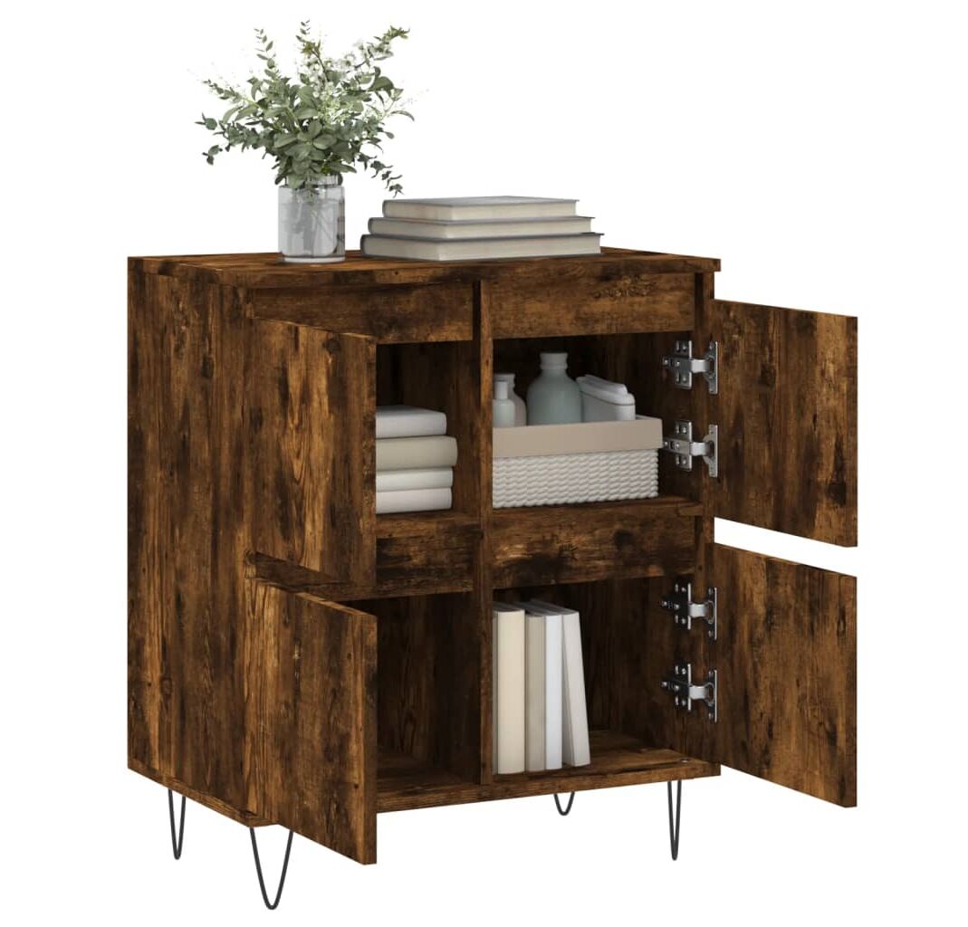 - Picioare de fier: Picioarele de fier ale acestui dulap lateral asigură robustețe și stabilitate.
