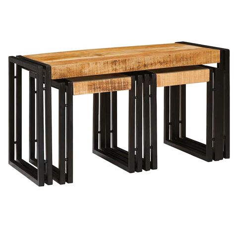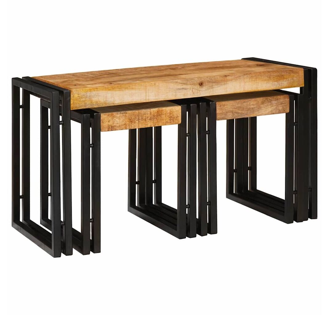 Setul ăsta de trei mese în cuiburi combină perfect funcționalitatea cu estetica. Făcute din lemn masiv de mango și un cadru din metal negru mat, fiecare masă are textura ei unică care adaugă caracter pe lângă practicitatea lor în spații interioare.