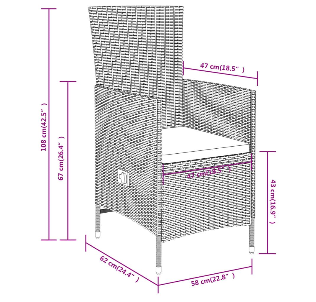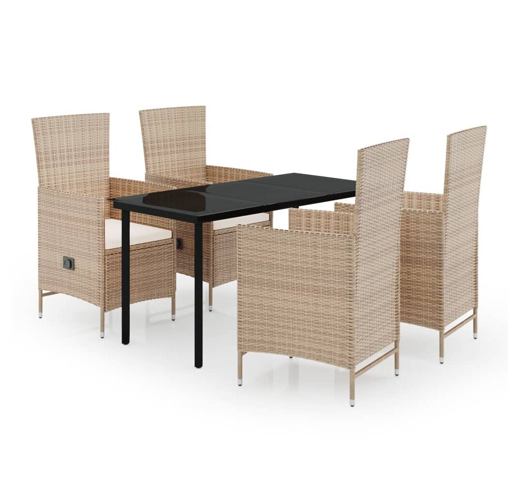 Cadrele din oțel vopsit electrostatic, fac ca masa și scaunele să fie robuste și stabile, pentru utilizarea zilnică în aer liber. Datorită ratanului PE rezistent la apă, scaunele sunt ușor de curățat și rezistente la uzură. Spătarul se înclină trăgând de butonul din lateral. Datorită construcției ușoare, sunt ușor de mutat. Pernele pentru scaune gros căptușite adaugă, de asemenea, un plus de confort. Husele de perne din poliester, cu întreținere redusă, pot fi îndepărtate și spălate cu ușurință. În plus, blatul mesei din sticlă netedă este ușor de curățat cu o cârpă umedă și perfect pentru așezarea mâncărurilor, băuturilor sau a obiectelor decorative.