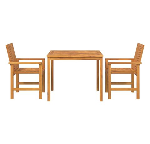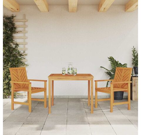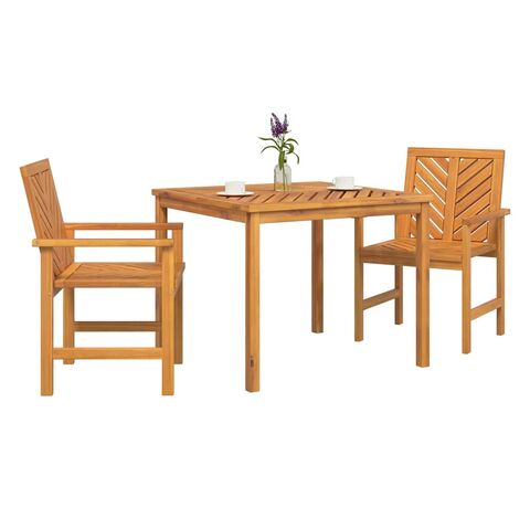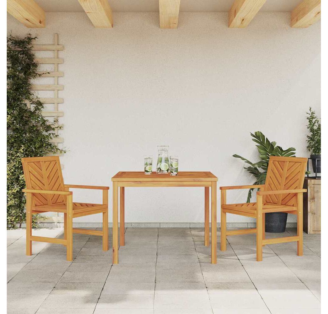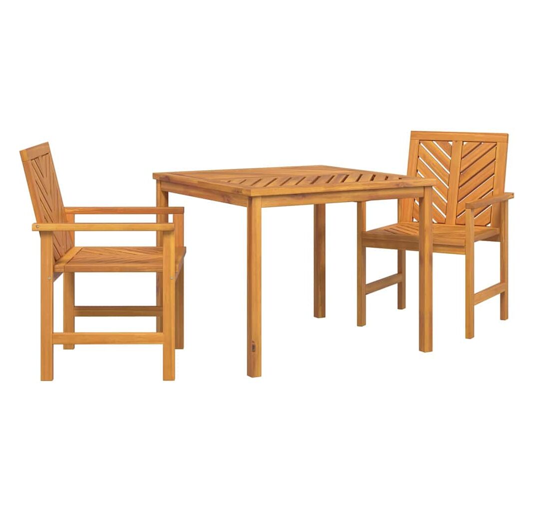 Setul ăsta de dining pentru grădină e perfect pentru spații mai mici, combinând funcționalitatea cu stilul. E din lemn solid de acacia și vine cu o masă pătrată și două scaune frumos proiectate, perfecte pentru întâlniri pe balconul sau patio-ul tău.