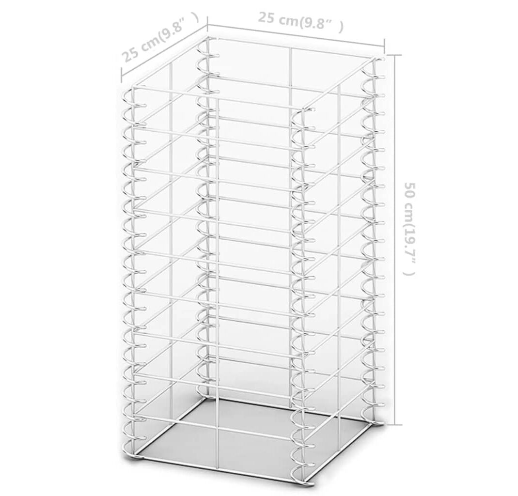 Fiind fabricat din oțel galvanizat rezistent la rugină și intemperii, acest set cu gabioane este foarte stabil și se va bucura de o durată lungă de viață. Grilajul din plasă este format prin sudarea firelor de sârmă transversale și longitudinale la fiecare intersecție. Având un diametru al sârmei de 3,5 mm, setul cu gabioane este stabil și robust.