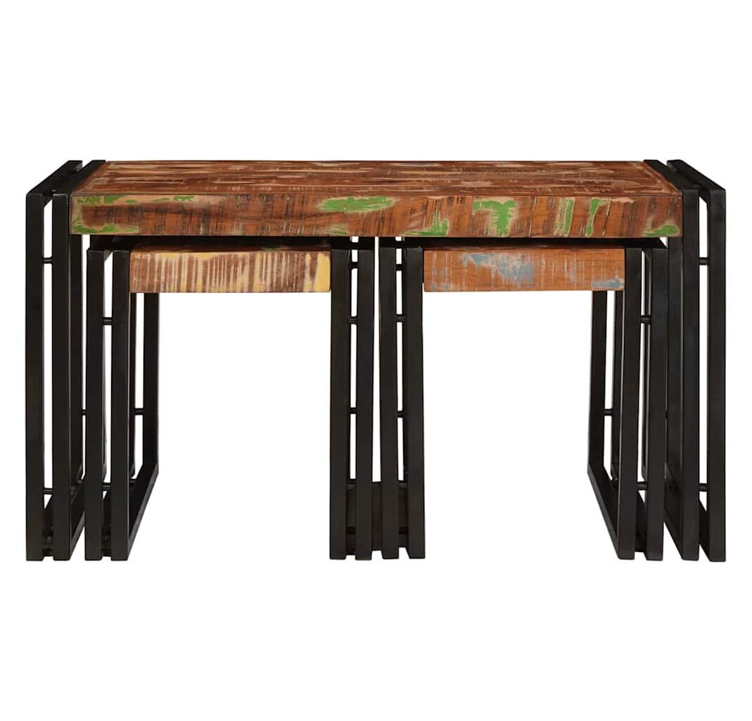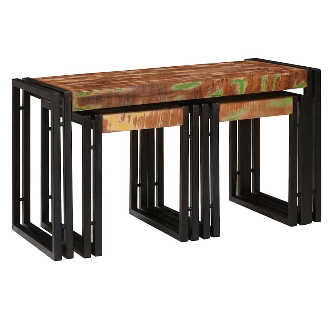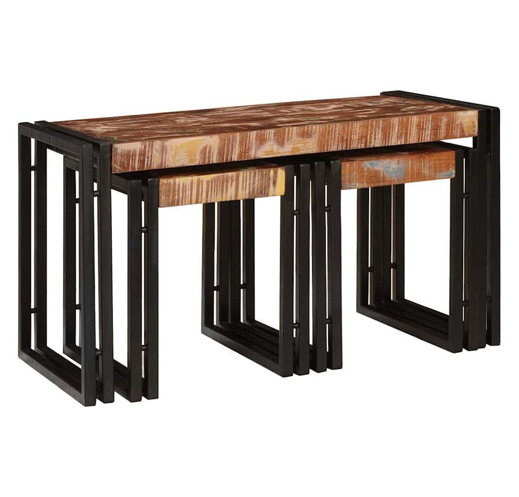 Acest set genial de trei mese în cuiburi combină un vibe industrial cu utilitatea. Făcute din lemn recuperat, fiecare are modele unice de granulație care adaugă personalitate, fiind super utile în casa ta.
