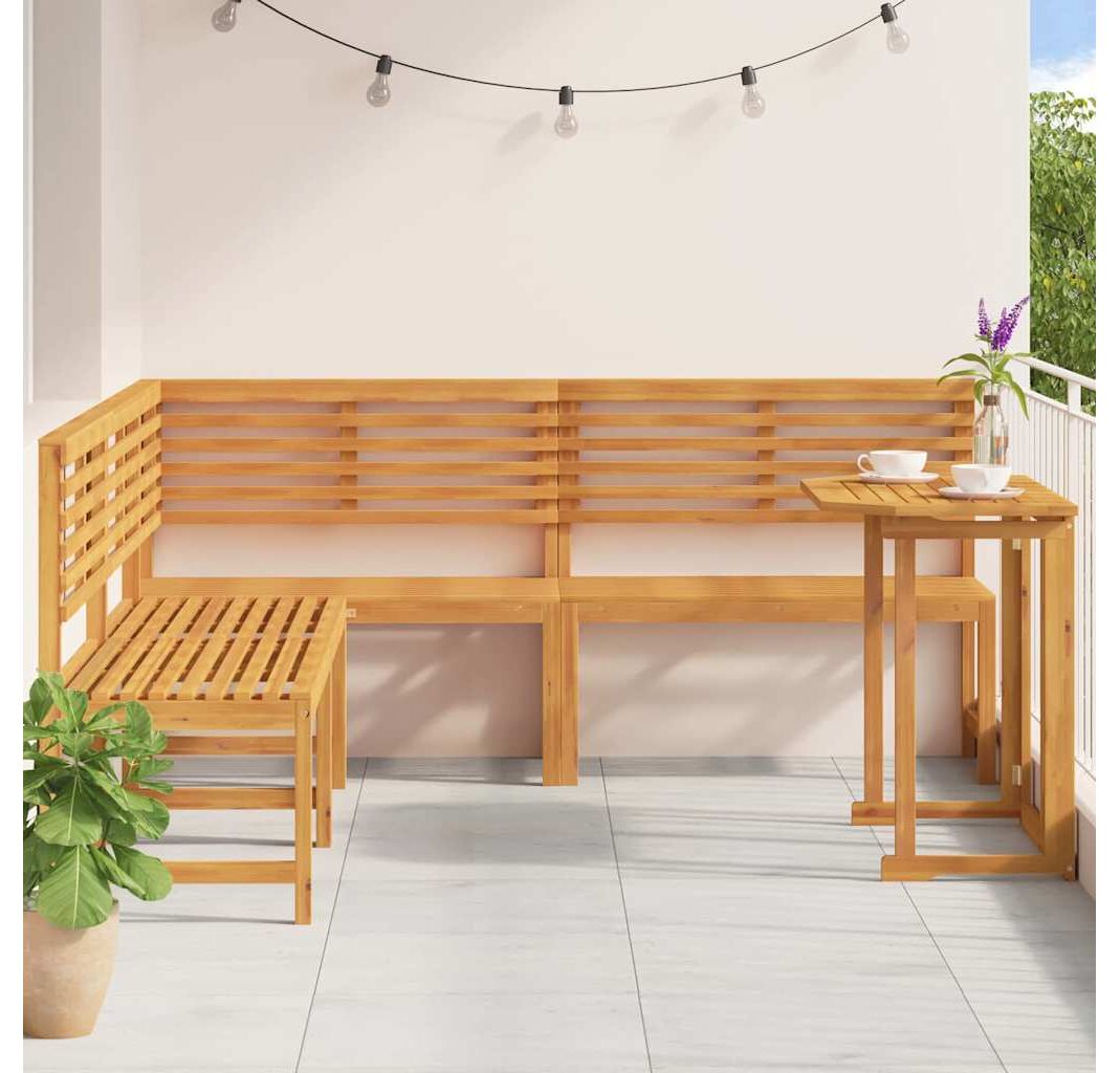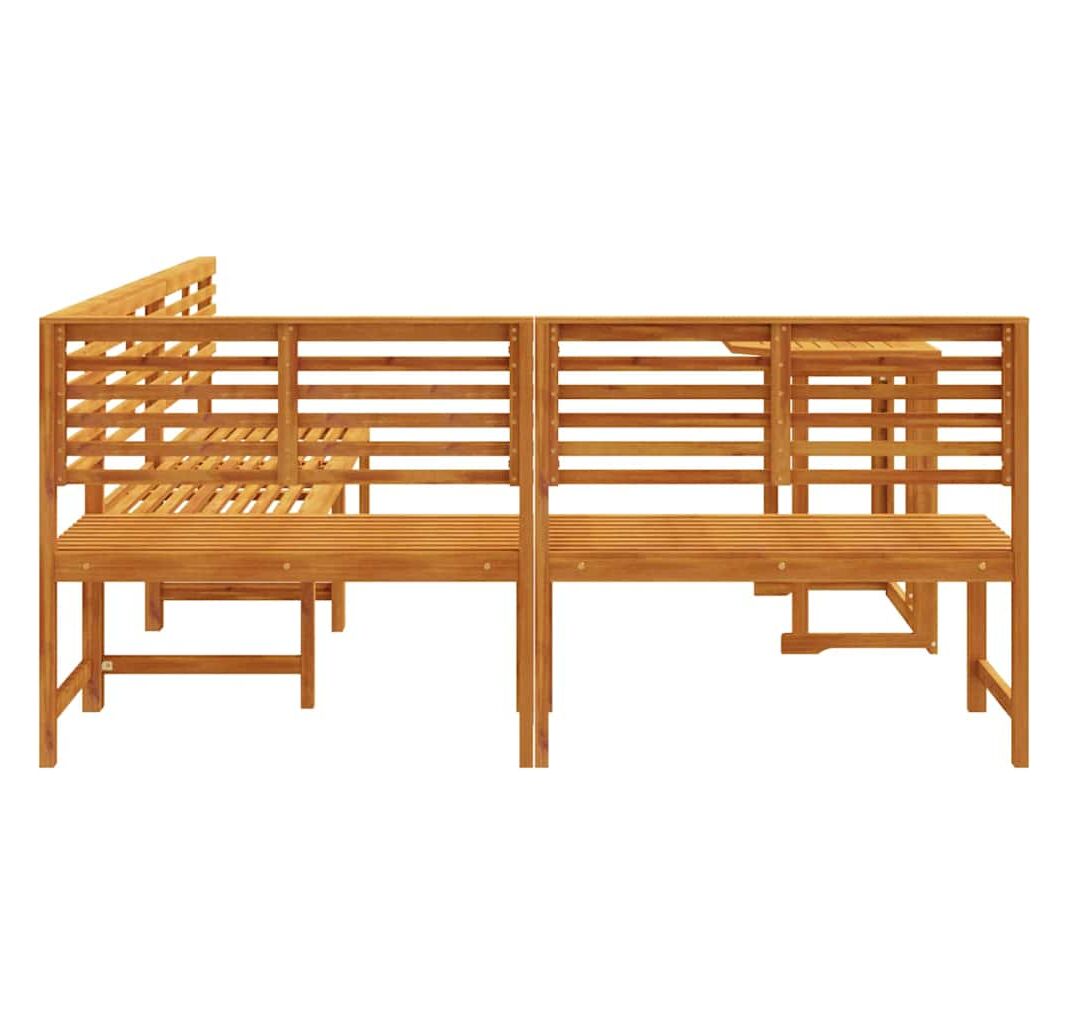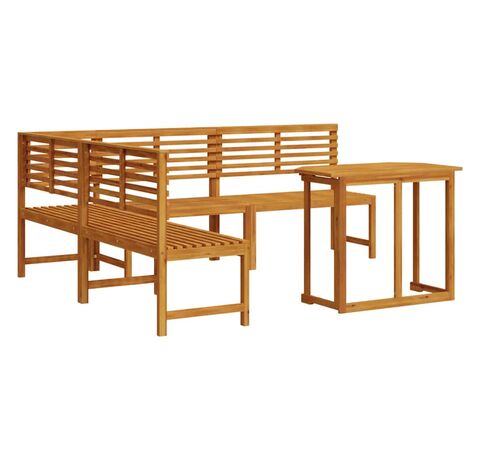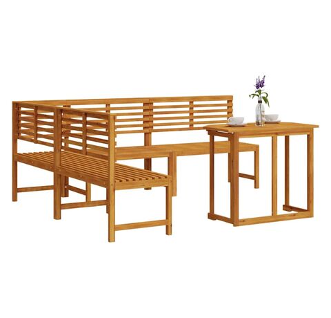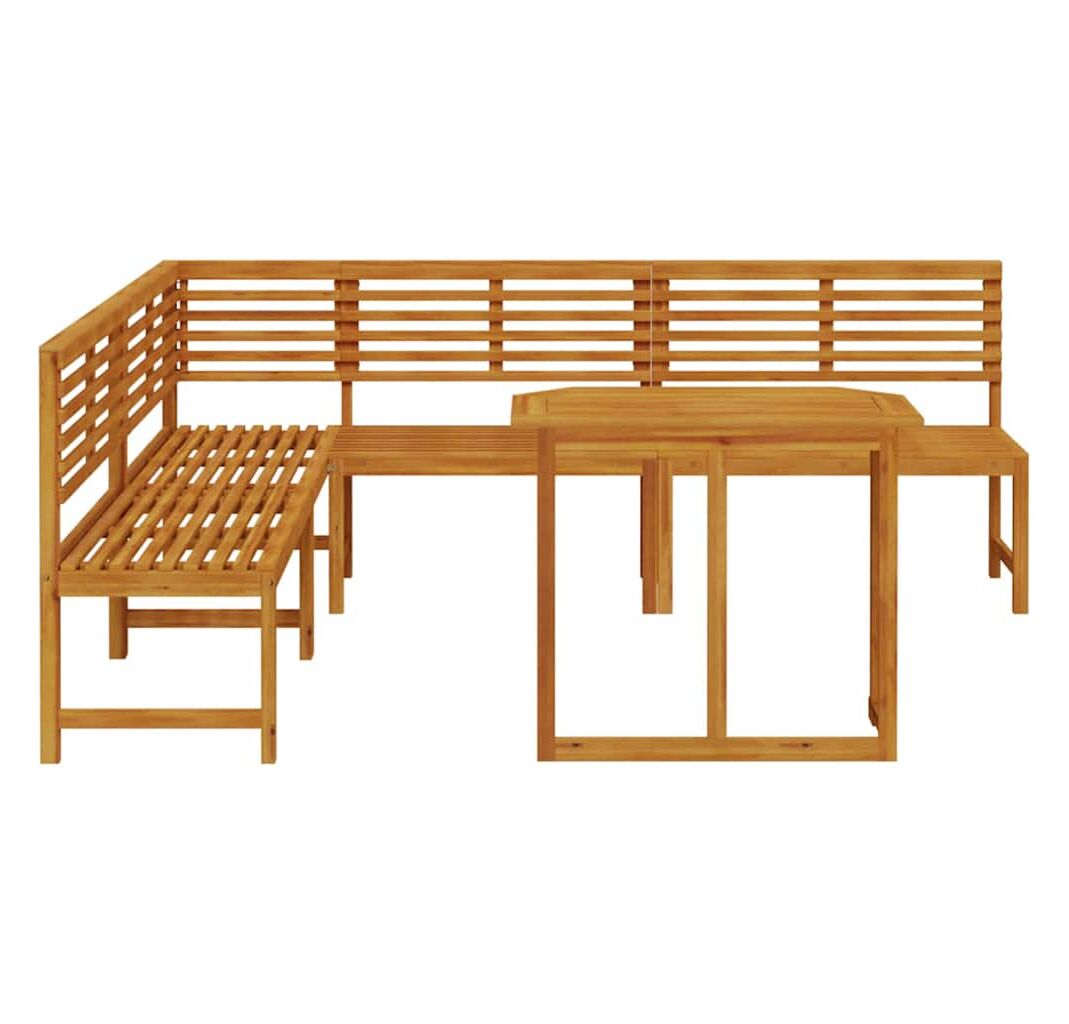 - Setul de dining e realizat din lemn masiv de acacia, asigurând durabilitate și rezistență la intemperii, ideal pentru utilizarea în exterior.