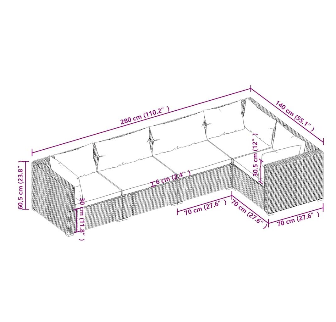 • Dimensiuni canapea colțar/de mijloc (fiecare): 70 x 70 x 60,5 cm (L x l x î)